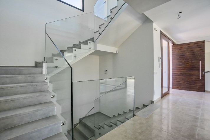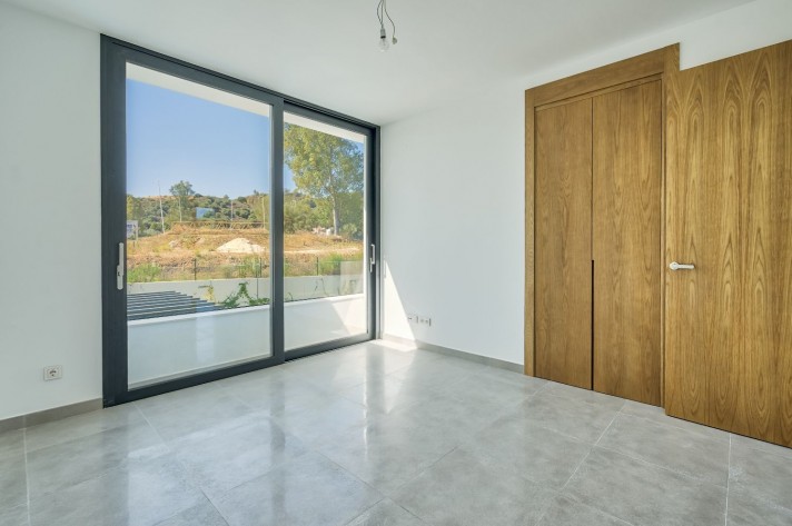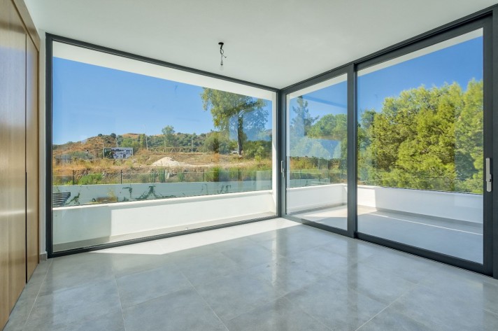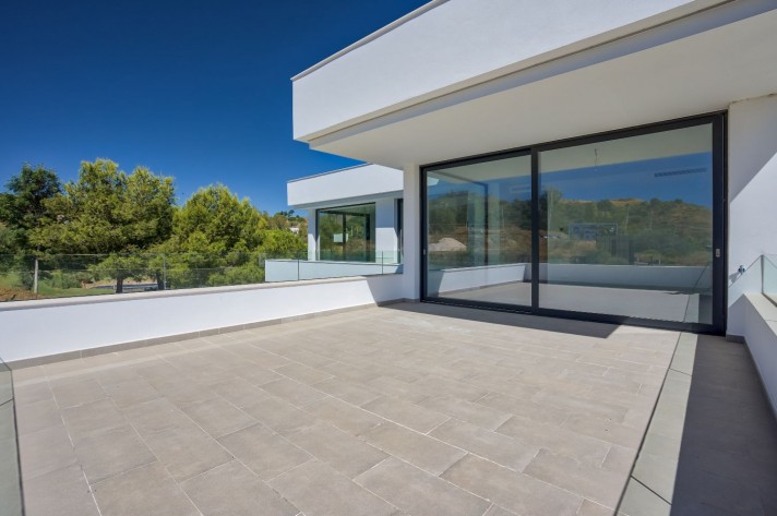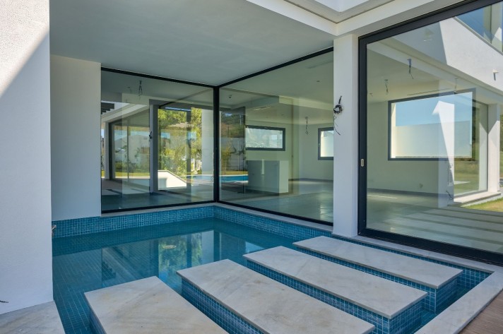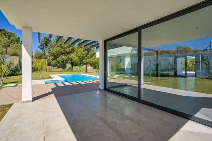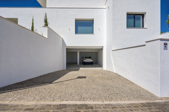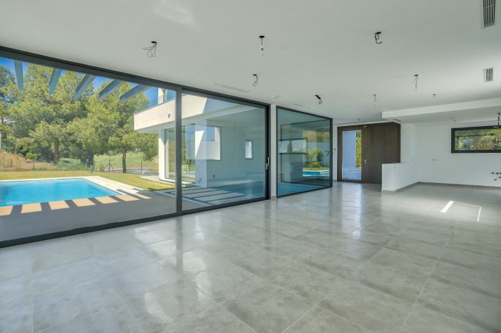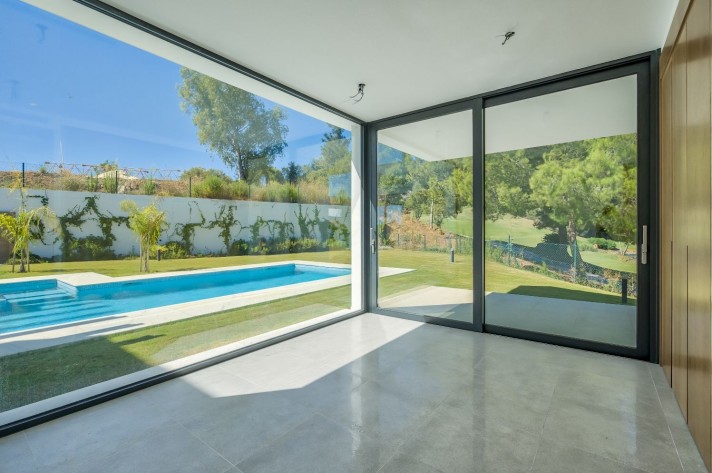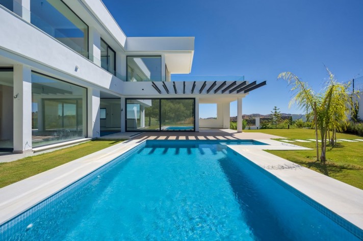 The location enjoys an extreme tranquility.Description: Entering through a large portal with remote control is a garage with capacity for 5 cars, spacious and bright connected to the side of the machine room (pool cleaner, heat pump for the underfloor heating throughout the villa, 2 tanks of water reserve and site for tools), on the other a large surface for laundry and another that could be used as a leisure place, a cinema or even an office with the possibility of installing a large window.A wide central staircase with space for a possible hydraulic glazed elevator(optional), communicates to the next floor and entrance/reception, being left a good surface for the kitchen in an open plan, annexing the living and dining room, bordered by an exceptional pool and leisure and comfort area for "alfresco" meals under a design pergola. The access to the terrace and garden areas is through two huge windows that reach from the floor to the ceiling. Towards the right side of the entrance to the villa there is a complete bathroom and an office or bedroom for guests that focus on the pool on one side and a covered porch and garden with views over the lake at Hole6 of the golf course by the other. On the upper floor, there are three additional bedrooms; one of them is the master bedroom with bathroom on suite a large terrace with excellent views and a spectacular dressing room.