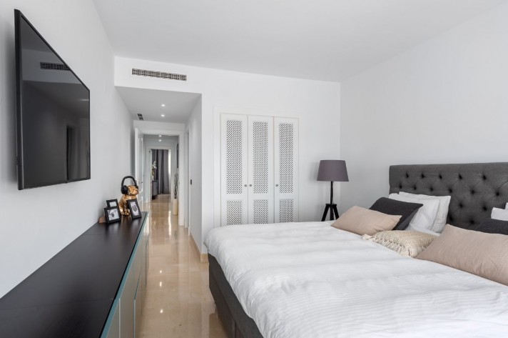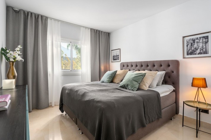 Located in a prestigous urbanization, in the hills of Nueva Andalucia. Direct access from the garage up to the renovated apartment with 3 bedrooms and 2 bathrooms, open floor plan with kitchen and living room area. From the living room area and master bedroom with direct access to the spacious terrace with lounge, dining and barbeque area, and a fantastic view over Gibraltar to the afternoon and evening sun.