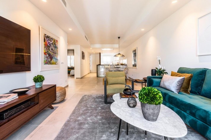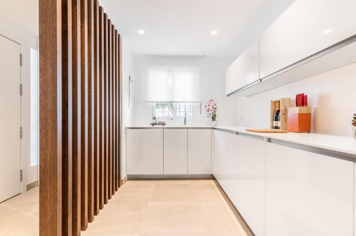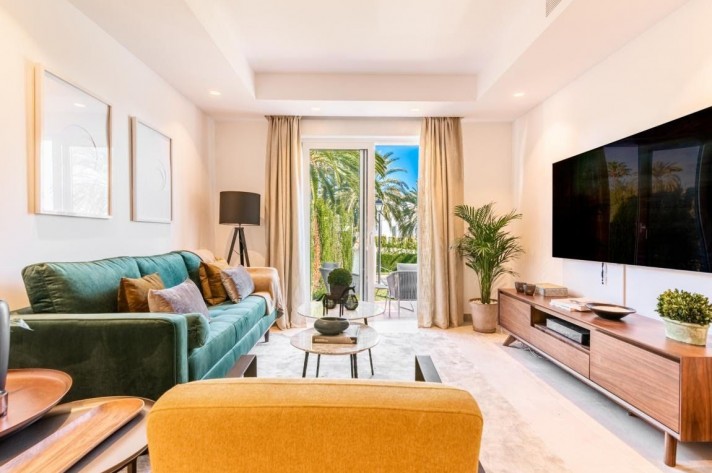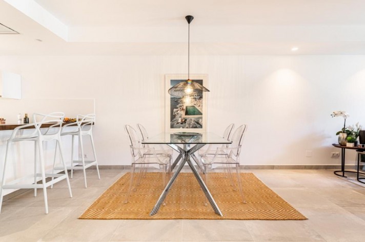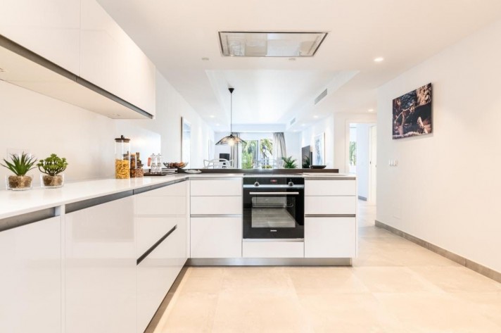 This fabulous two bedroom apartment boasts a relaxing terrace with north-east facing views of gardens and pool area. High-spec finishes throughout including fully fitted Porcelanosa kitchen, beautiful Porcelanosa bathrooms and brand new furniture from brands such as Kartell, BoConcept, El Corte Ingles and Jensen Beds. Set within this magnificent development walking distance to the beach, Puerto Banus and all amenities, it exudes modern and easy lifestyle from the entrance to the impeccable interior; with 24-hour security, communal parking, tennis court and one of the biggest swimming pool areas in Nueva Andalucia. Other features include central A/C throughout the house, large Porcelanosa tiles and underfloor heating in both bathrooms.