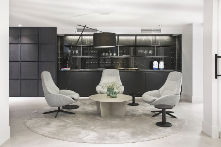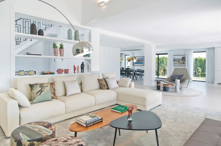 It immediately welcomes you with an impressive driveway leading up to the entrance of the home. The entrance has double-height ceilings with great natural light and gives you a striking overview of the open-plan layout. On this level, you have a spacious living area, connected with both dining and kitchen. It has been designed with white wooden details and marble countertops to create a modern and homely feel.