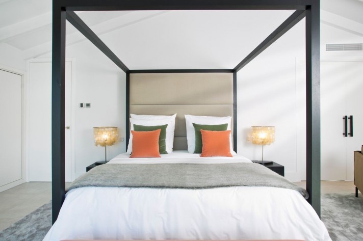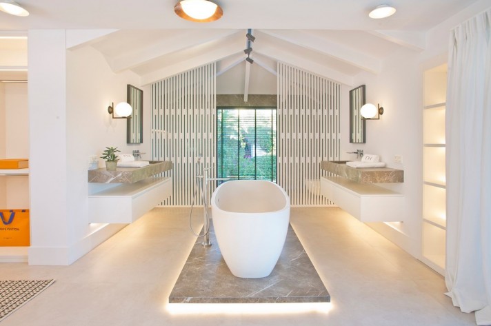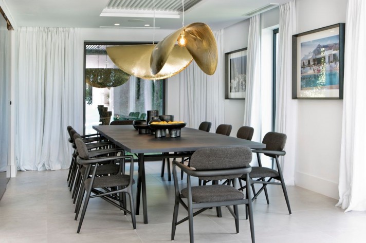 Large open windows that are showcasing the beautiful outdoor dining, garden and pool. From here you also have open views to the golf course and sea. The villa is south facing and has sun all day. Connected closely to the kitchen there is a gazebo with dining and an outdoor kitchen where you can enjoy the afternoon sun. On this level, you have two guest bedrooms en suite.