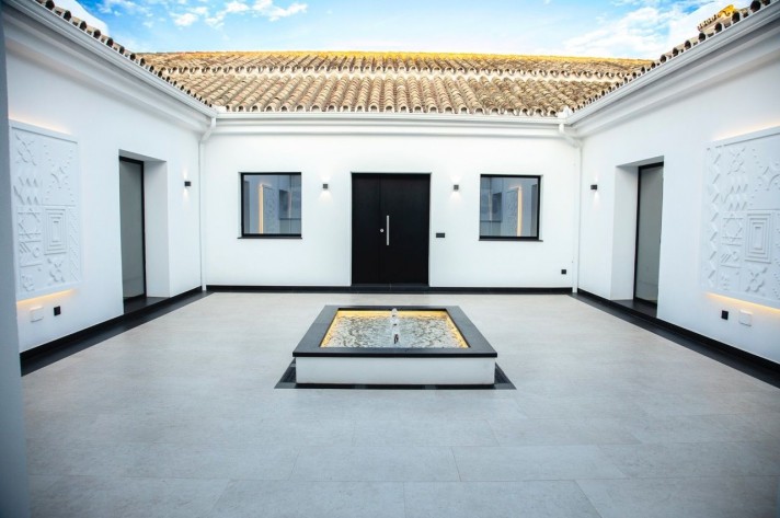 The house comprises a beautiful entrance hall, contemporary open plan kitchen with NEFF appliances, spacious living/dining room with fireplace and access to a covered terrace, pool and garden area where you can enjoy the panoramic towards La Concha mountain and partial sea views .