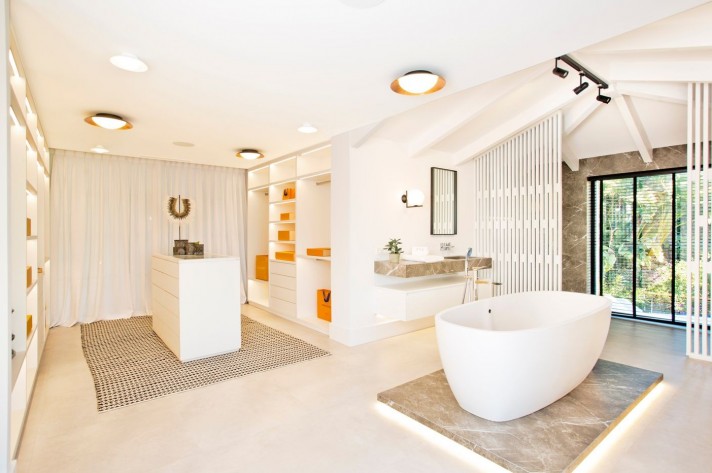The stairs in the entrance will lead you to the master suite, where we have dedicated the whole upper floor for the owner to have a master they deserve. Impressive bedroom with generous space for both a king size bed and living room. A walk-in closet with automatically closing curtains and a bathroom with his and hers sink, shower and bath tub.