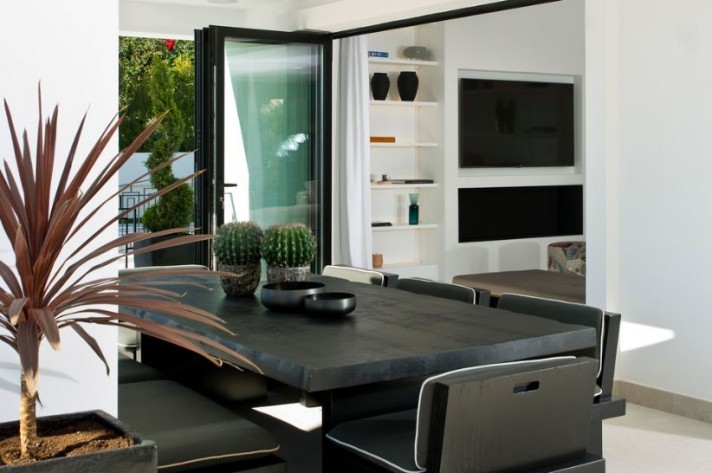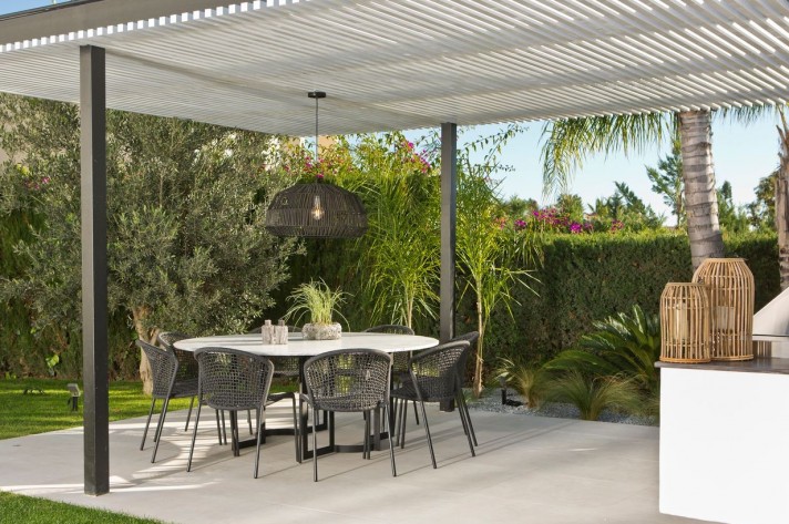Large open windows that is showcasing the beautiful outdoor dining, garden and pool. From here you also have open views to the golf course and sea. The villa is south facing and has sun all day. Connected closely to the kitchen there is a gazebo with dining and outdoor kitchen where you can enjoy the afternoon sun. On this level you have two guest bedrooms en suite.