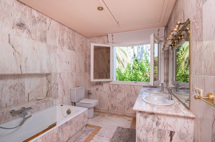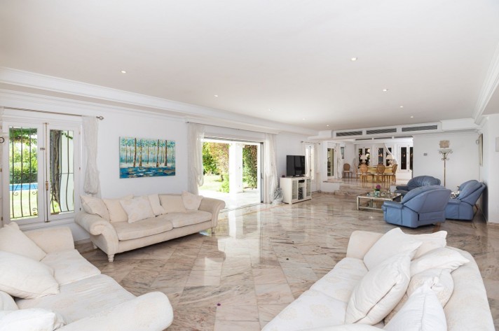 The villa is accessed through a large private drive way leading to a carport for two cars on one side and a private garage on the other side. Elegant entrance hall with sweeping staircase on the right hand side, five double suites, double height large living-dining area, fully fitted kitchen with breakfast room, laundry room, guest bedroomw with access to the porsche, staff quarters with shower room and a guest toilet. On the upper floor, further four guest suits and master bedroom with walk-in wardrobe and access to a private sun filled marble terrace.