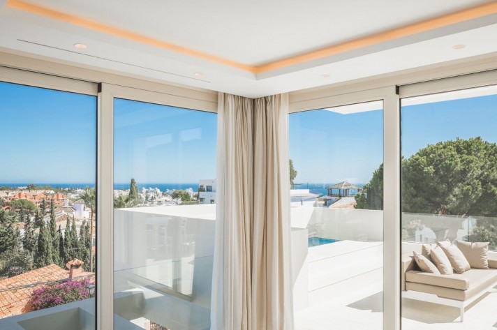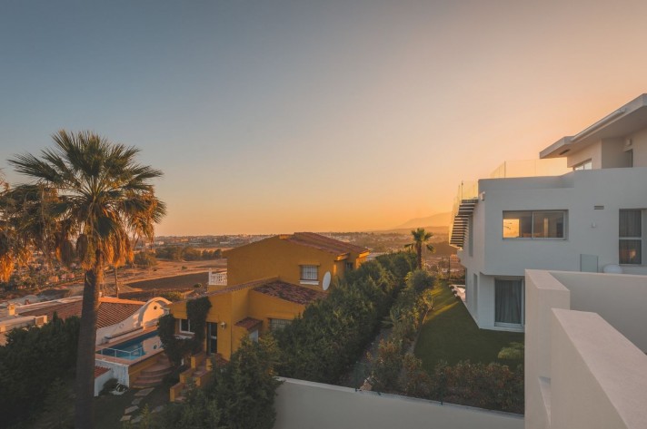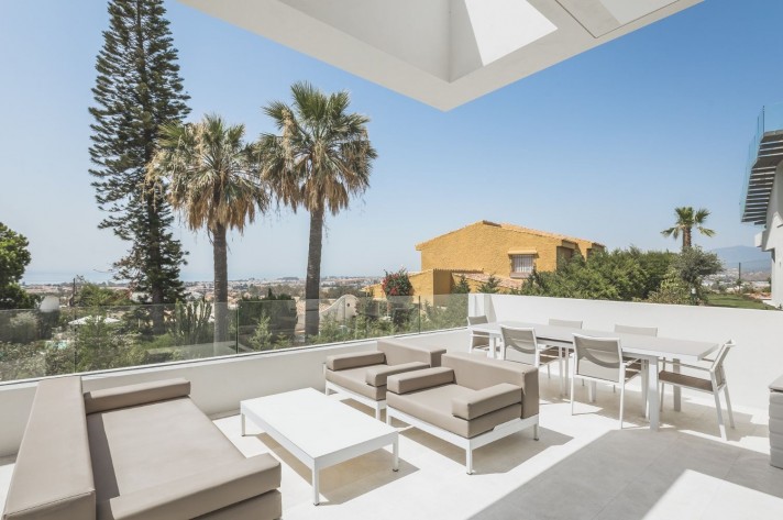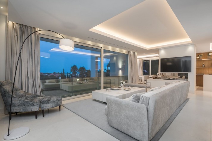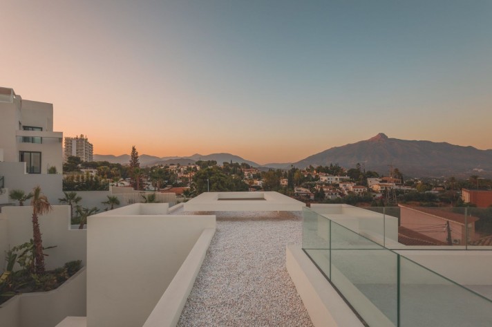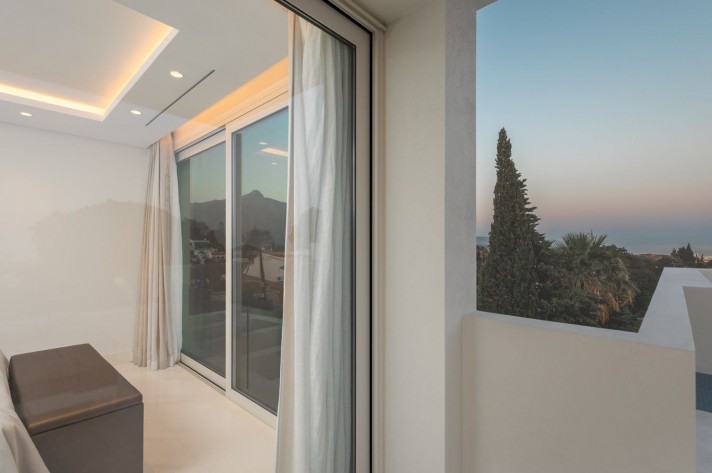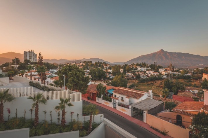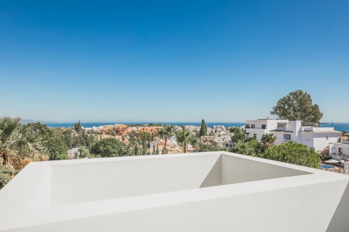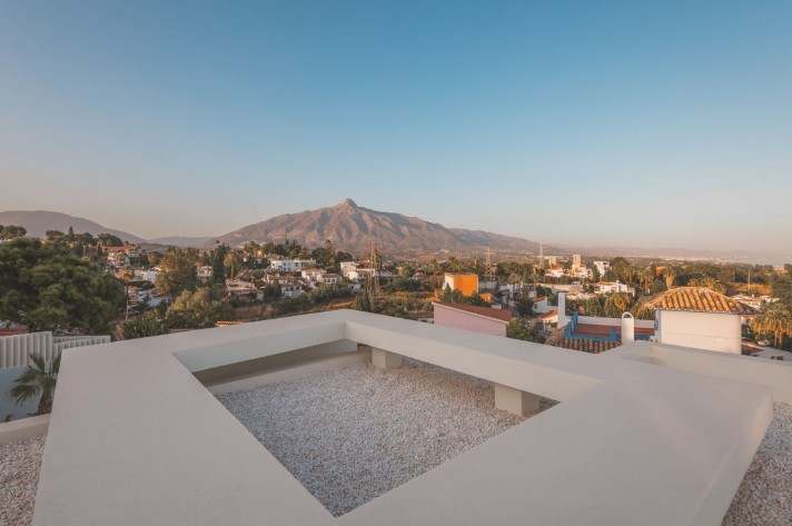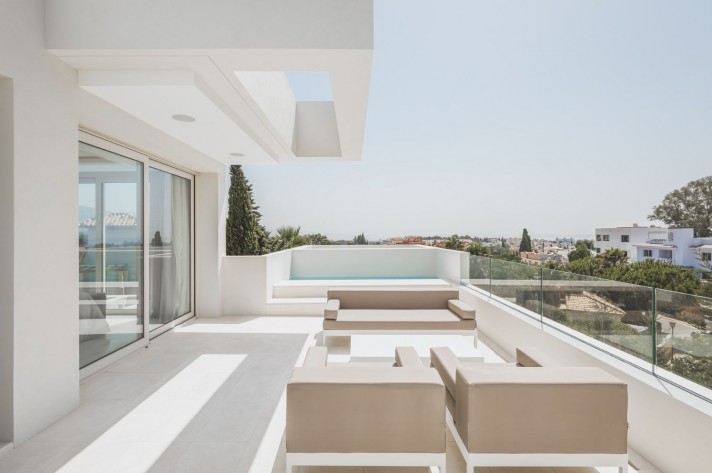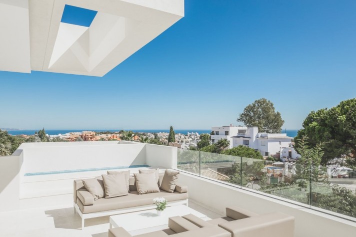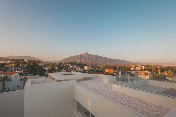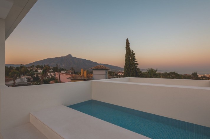 Contemporary brand new villa with sea and mountain views fifteen minute walking distance to Puerto Banús and the beach! The property consists of a bright double-height open-plan living/dining area with fireplace, opening onto a lovely terrace and garden with infinity swimming pool, enjoying the views towards the sea in Puerto Banús and La Concha mountain, fully equipped openplan kitchen with top quality appliances, a bedroom suite with walk-in closet and a guest toilet.