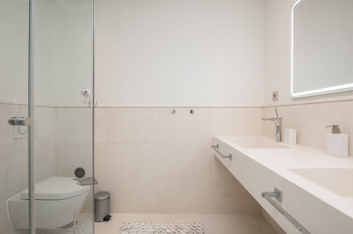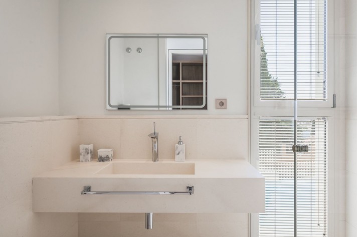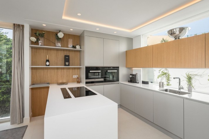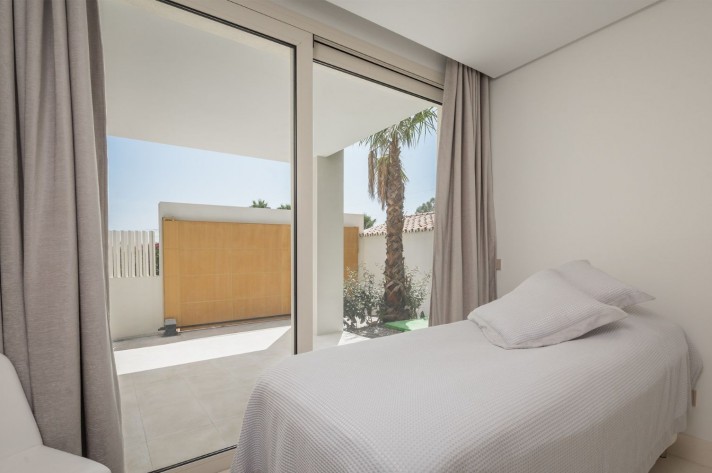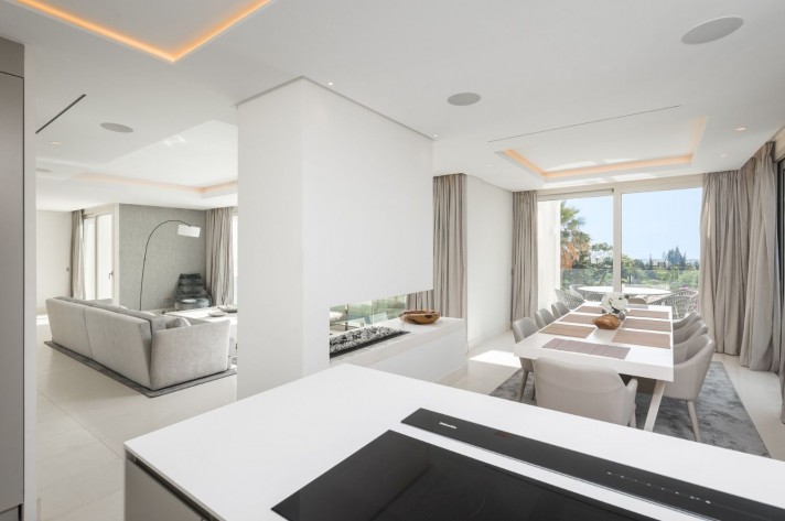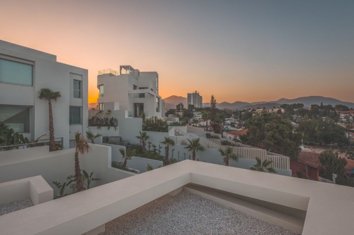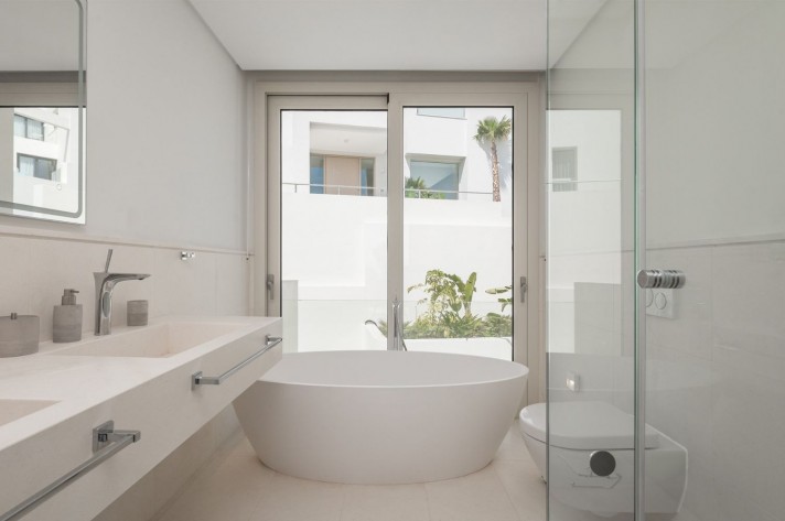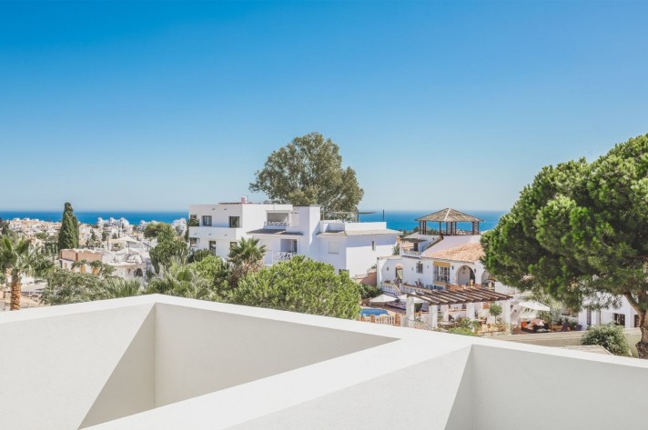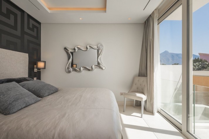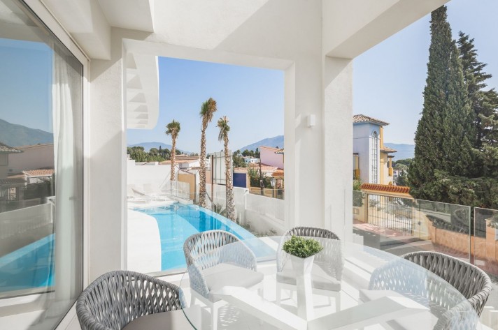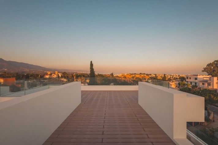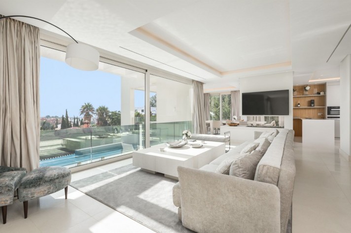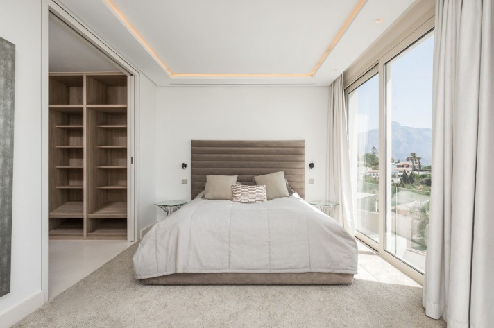 Contemporary brand new villa with sea and mountain views fifteen minute walking distance to Puerto Banús and the beach! The property consists of a bright double-height open-plan living/dining area with fireplace, opening onto a lovely terrace and garden with infinity swimming pool, enjoying the views towards the sea in Puerto Banús and La Concha mountain, fully equipped openplan kitchen with top quality appliances, a bedroom suite with walk-in closet and a guest toilet.