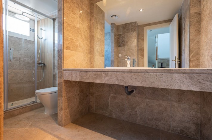 On the upper floor, there is the master bedroom with en suite bathroom and access to the terrace, two further guest bedrooms sharing one bathroom -one of which is children's room-. On the top floor, there is empty space designated for multiple choices, bedroom, office, gimnasium...etc with access to an open terrace enjoying the morning sun. Other features are, private outdoor parking space, marble flooring and air conditioning controlled individually. A house ready to live in. Astounding rental demand all year round!