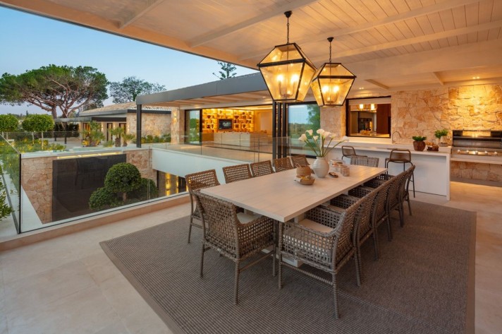 The living room is spacious, enjoys large floor-to-ceiling windows that retract and create a seamless fusion of indoor and outdoor spaces. On this open-plan wing, we can find a delicate kitchen fully fitted and equipped with top of the line appliances, a bright office room and an entertainment space with a bar, TV area and pool table. On the left wing of this exquisite mansion, we can find 4 exceptional suites with direct access to the garden and with magnificent views to the lush vegetation.
