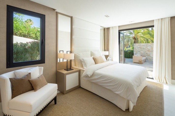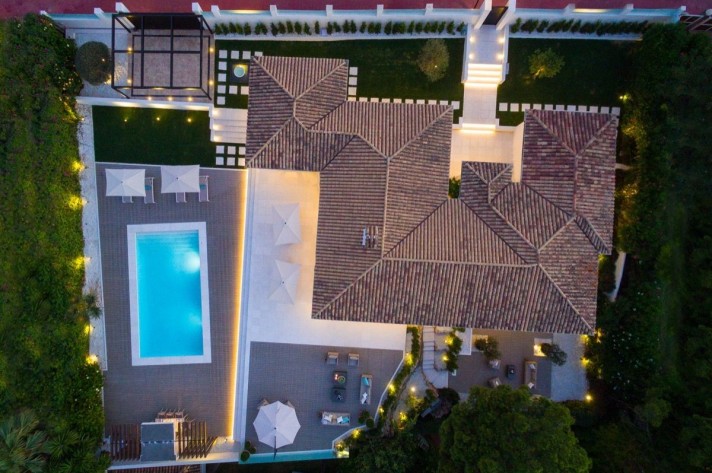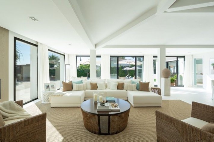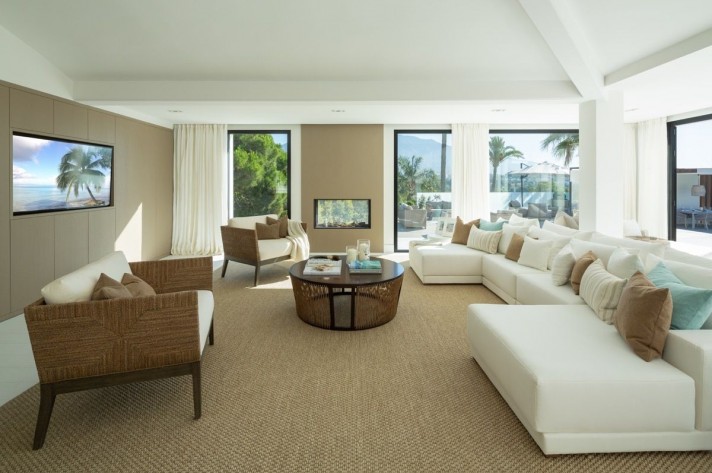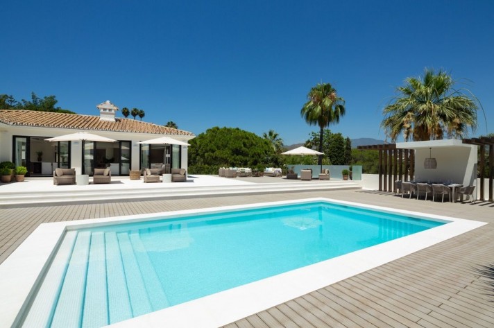 Completely renovated villa in Las Brisas with spectacular views of La Concha. This villa is a modern bungalow-style , exquisitely decorated with attention to detail and offers 5 ensuite bedrooms and a stunning outdoor pool area with multiple seating areas and a spacious turquoise pool. It also boasts spectacular views from its south-east facing pool area, outdoor garden area with a cozy fireplace and lounging area.