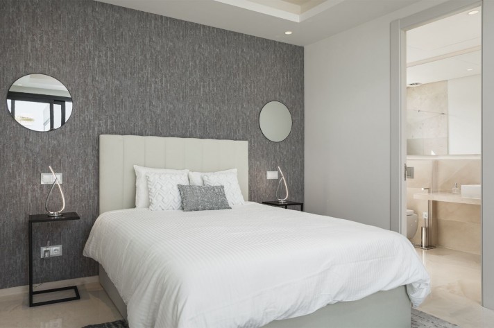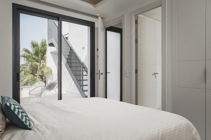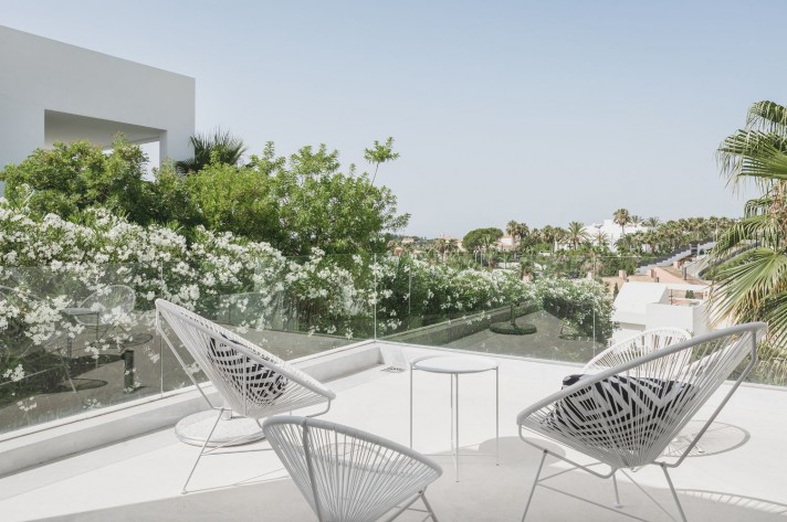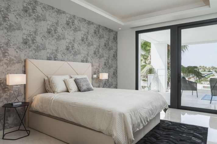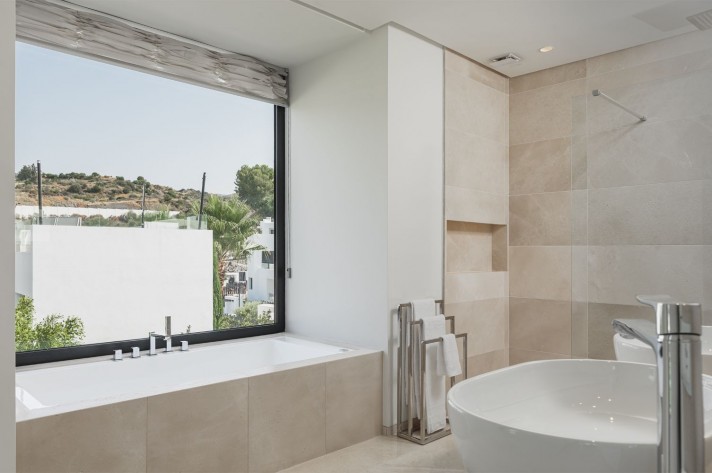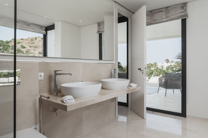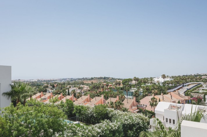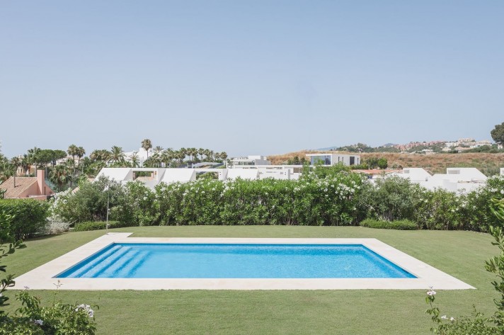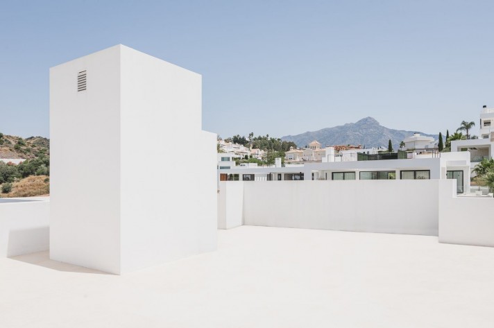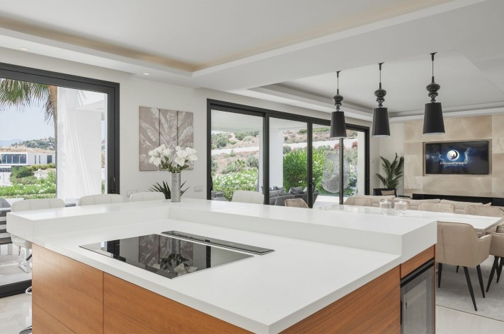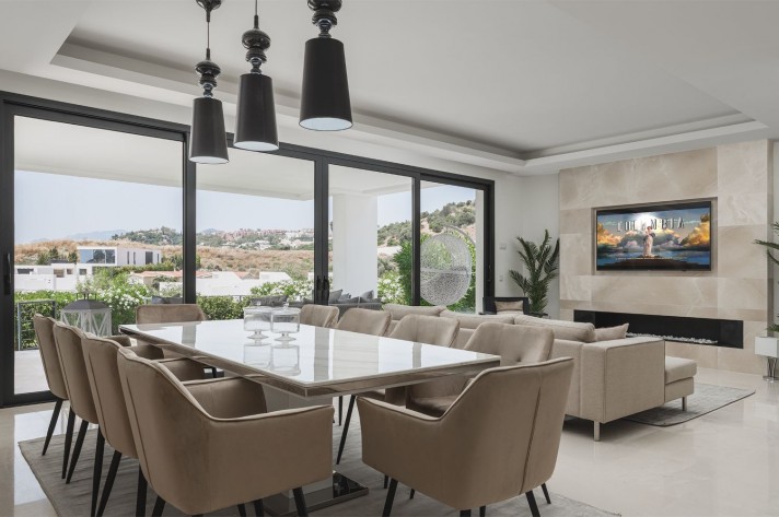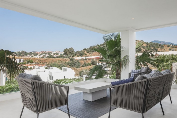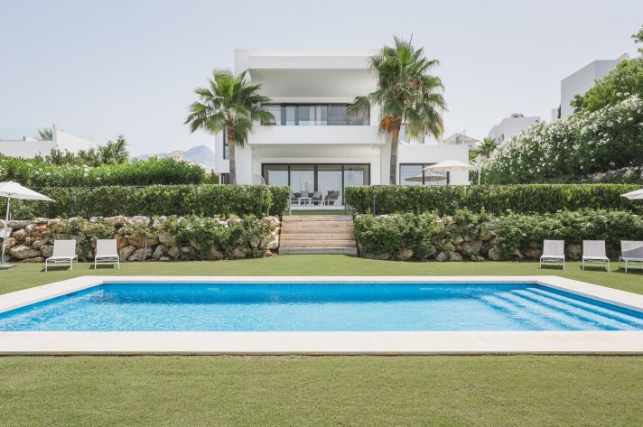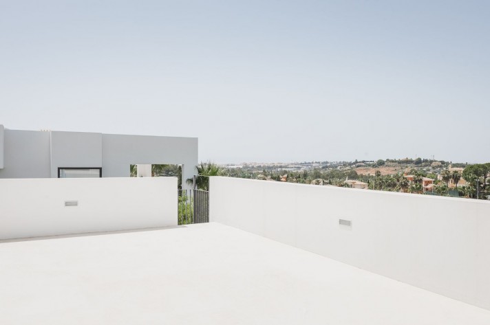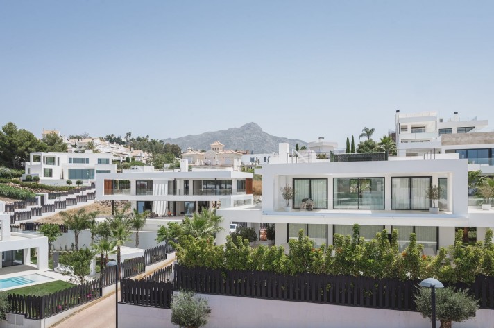Brand-new contemporary luxury villa in a prestigious location in the famous Golf Valley, with the spectacular backdrop of Marbella’s iconic La Concha Mountain. Recently built to top specifications and finishes, this 5-bedroom villa pays special attention to the Andalusian climate, with plenty of outside seating areas carefully shaded and perfect for relaxing. Distributed on three levels plus rooftop solarium, it comprises, on the main floor: spacious living room with several seating areas; open-plan fully fitted kitchen/dining area equipped with top appliances and with a central island and wine cooler; 2 en-suite guest bedrooms; access to the porches, terraces, swimming pool and the carefully landscaped garden with mature plants that surround the property create privacy from nearby homes. Upstairs: two guest en-suite bedrooms with fabulous views over the Golf Valley, one of them with access to a private terrace; stunning master suite with dressing room and access to a private terrace also enjoying the amazing views. Lower level: garage for 3 cars; utility room; laundry room; storage room; guest toilet. Special features include underfloor heating in the bathrooms, domotic and music system throughout. Just minutes away from several international schools, gastronomic experiences and amenities, this magnificent corner villa is set within a quiet gated complex with 24-hour security, guaranteeing a total privacy.