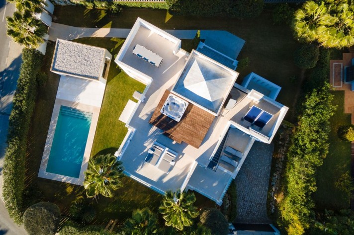 The living area is connected to the covered terrace and the manicured garden of this luxury home. The terraces boast a dining area and chill-out spaces to enjoy the sunny weather all year round by the pool. The villa enjoys generous bedrooms on the upper level, with direct access to a sunny private terrace.