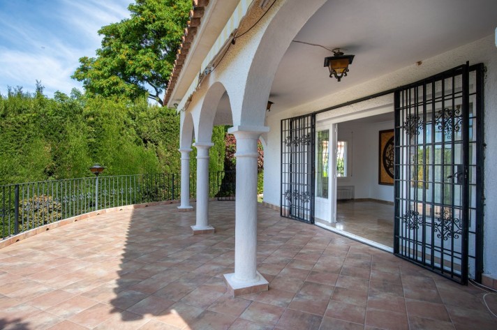 The living area opens onto the large covered South facing terrace and large mature gardens with family pool.