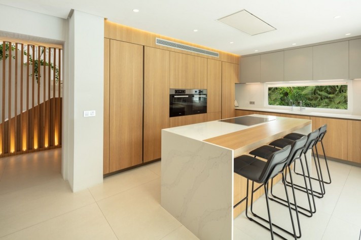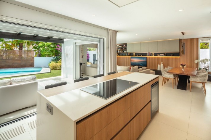 This welcoming property features a bright open plan family room complete with pocket terrace doors, opening up completely to the outdoors; an inviting chef's kitchen, with a breakfast bar and a separate dining area, all having easy access to the mature tropical gardens. Relax and unwind in the outdoor retreat, complete with inviting lounge areas and a tempting pool, designed to take full advantage of the Mediterranean lifestyle Marbella effortlessly provides.