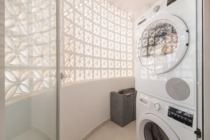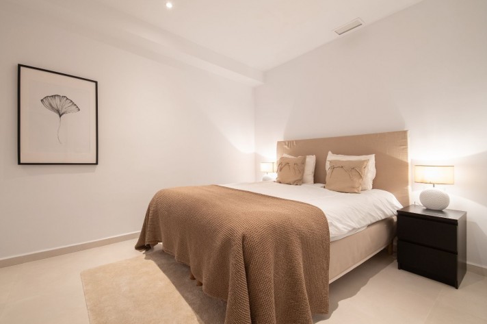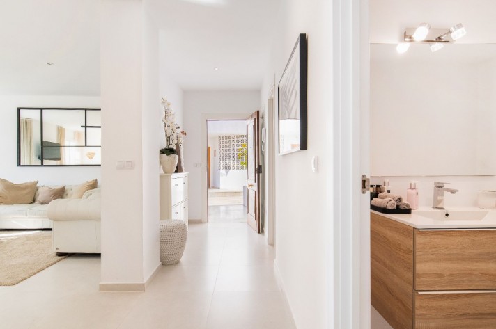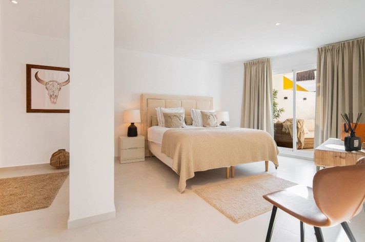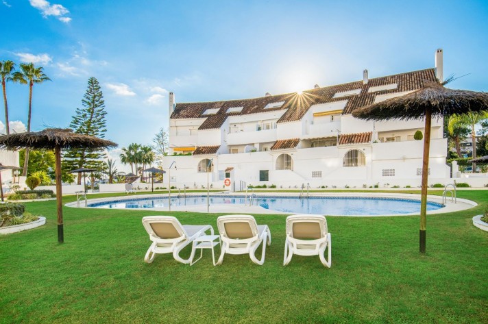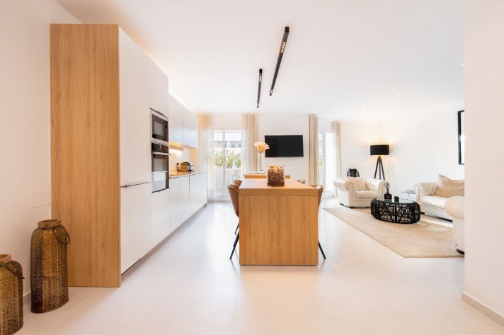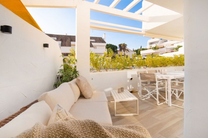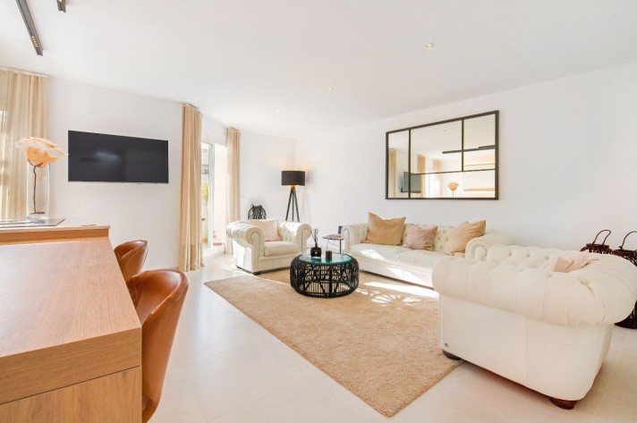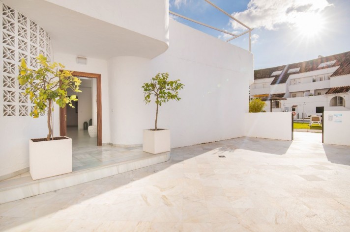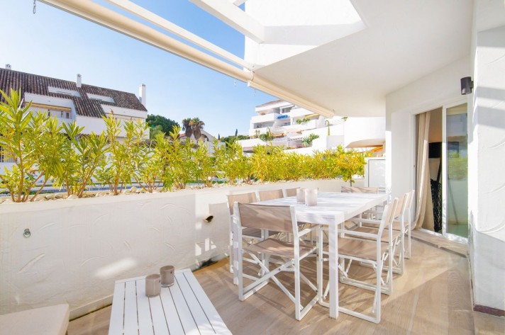 This newly renovated 4 bedroom ground floor apartment is lcoated in the urbanization of El Dorado in Nueva Andalucia, a prime location in the heart of the golf valley. It´s bright and spacious property comprising an entrace hall, two living rooms, fully equipped kitchen with direct access to the covered terrace.