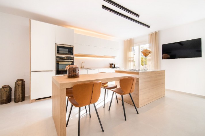 The accommodation consists of 3 double en suite bedrooms and one single room, guest toilet inthe entrace hall. Direct access to the pool, disigner kitchen with central island, are features that makes this property desirable. Close to the main golf courses in the area, walking distance to amenities and a short drive to Puerto Banus.