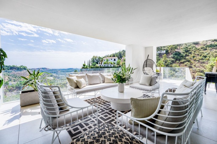 Spectacular house situated in the cozy hillside of El Madroñal. The house benefits from its elevated position and offers amazing sea views. The ground floor comprises of a big hall, two living rooms, a spectacular dining room and a beautiful contemporary kitchen. On the lower level, there are three good sized bedrooms, a gym, laundry room and spa.