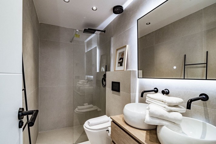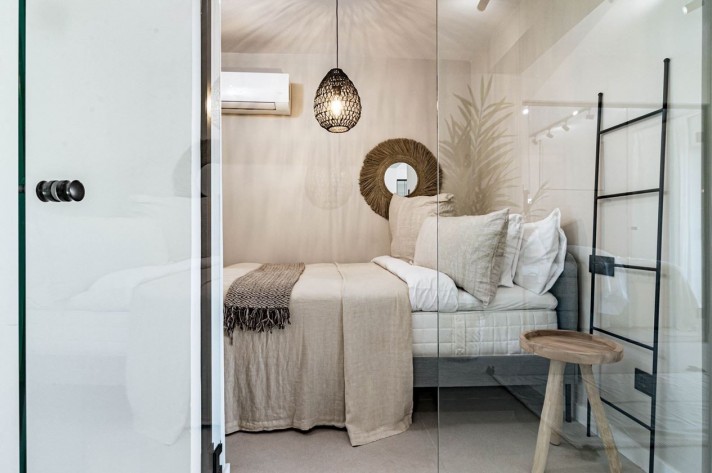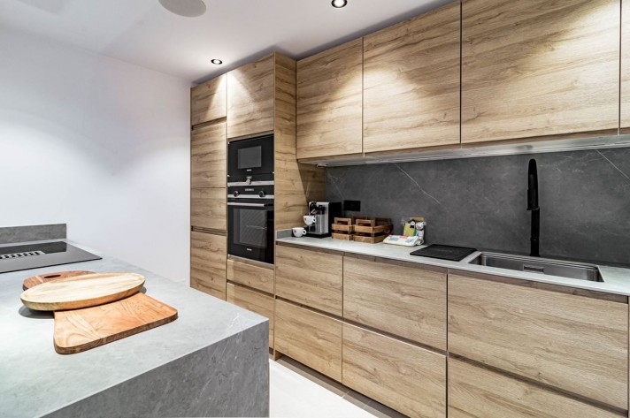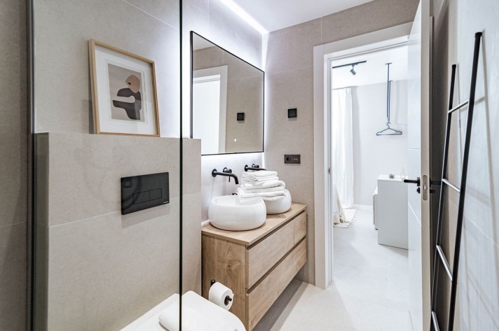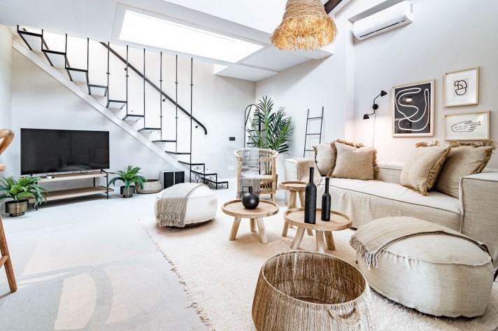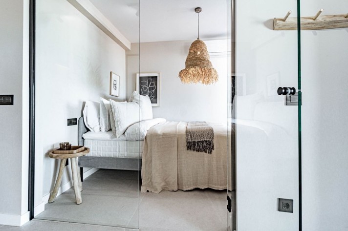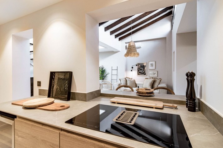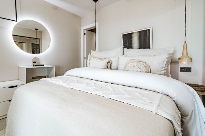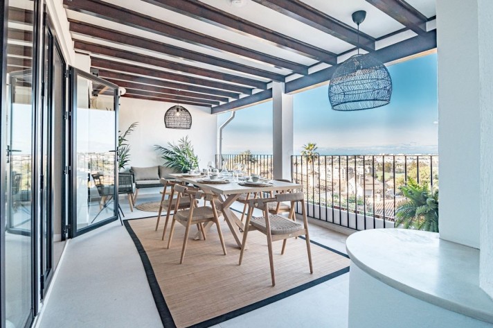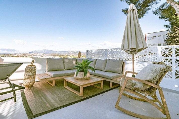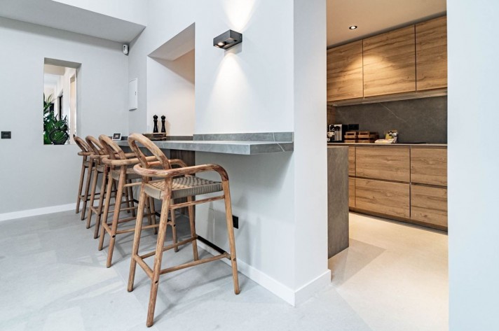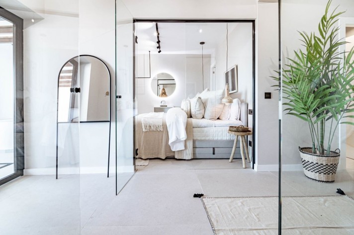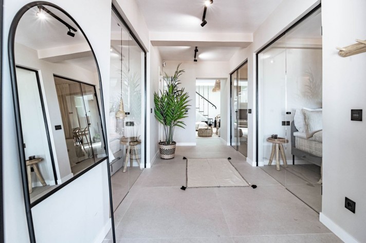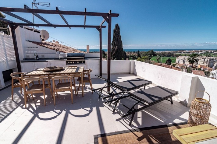 Straight ahead you then come to the spacious living room with an open plan kitchen with bar counter, perfect for eating a simple breakfast. In the kitchen there is also a wine fridge and speakers so you can play your favorite music both inside and outside on the terrace. From here you have the internal stairs up to the large roof terrace, where you can easily spend a whole day thanks to the outdoor kitchen with grill, fridge and dishwasher, from the terrace you have perhaps the best view you can imagine over the entire coast and the Mediterranean Sea as well as Gibraltar in sight. The house faces west, so you have the optimal position to enjoy sunset dinners.