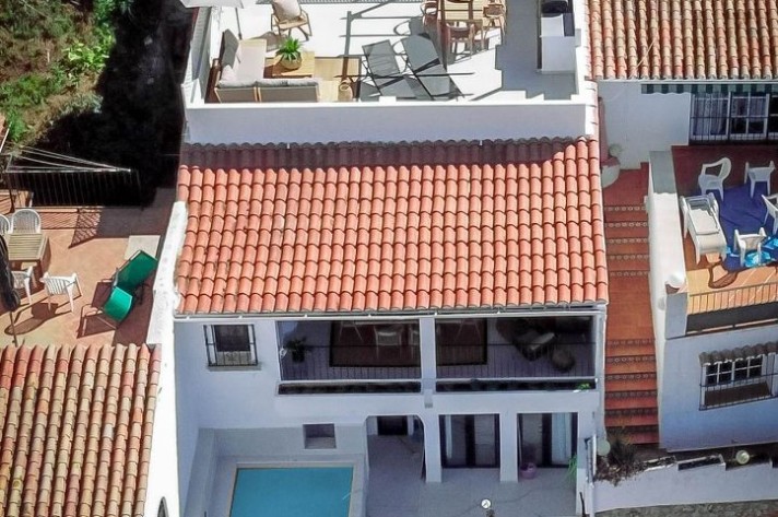 House with 4 bedrooms and 3 bathrooms, that is the perfect house for a social lifestyle. When you take the stairs up you are welcomed by a terrace with a private plunge pool, on this level you will also find a guest room with a bathroom and a wine fridge for cooling drinks on hot days. You continue up to the large terrace with fantastic views towards the coast and the Mediterranean, from here you enter the main house, the master bedroom has a private bathroom and the other two smaller bedrooms share a bathroom.