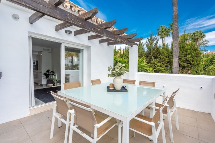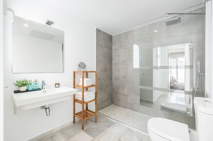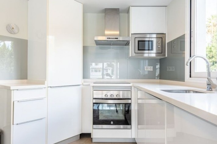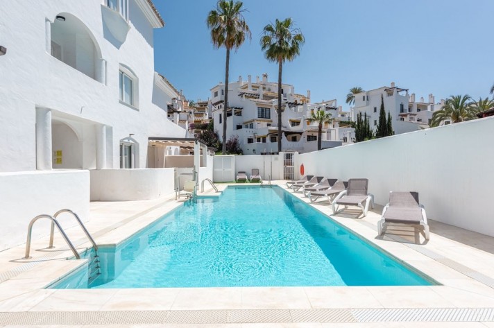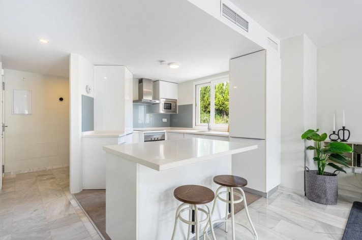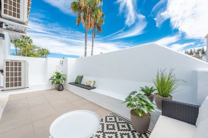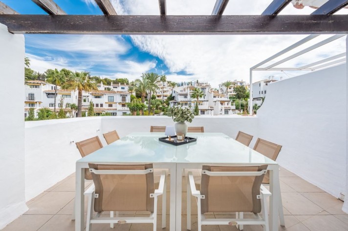 In the best location in Nueva Andalucia with walking distance to everything is this modern penthouse with two spacious terraces. The penthouse is optimally planned with an open plan kitchen / living room with a spacious terrace with a pleasant view towards beautiful Aldea Blanca. On this floor you also have a guest toilet. Upstairs you will find two bedrooms that share a spacious bathroom with shower, from both bedrooms there is an exit to the second terrace. The apartment comes with a garage space and storage room. Perfect apartment for those who want to avoid taking the car to everything, and is well suited for short-term rentals since all licenses are in place.