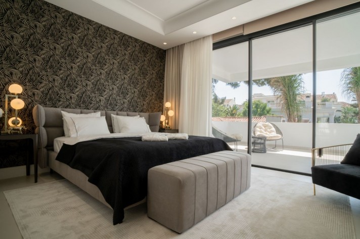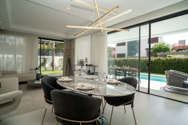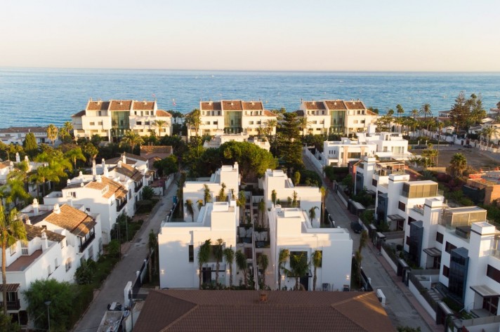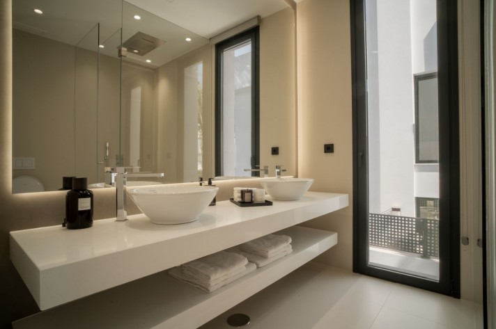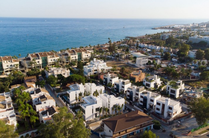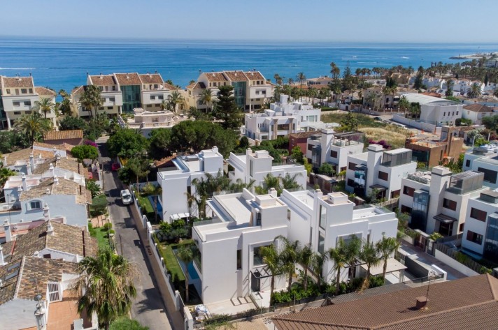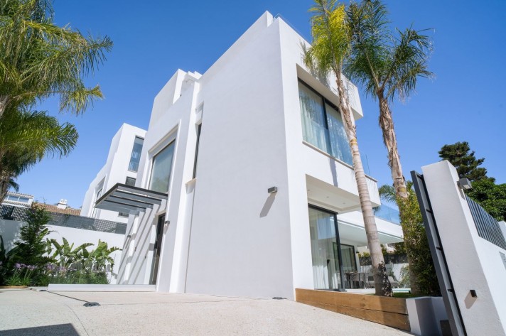 These marvelous new modern villas for sale are located in one of the most luxurious residential areas in Marbella – Golden Mile, in a secure urbanization Rio Verde, just 100 meters from the beach. The villas combine excellent quality, amazing location and the best price. Each house is spacious, full of light and equipped with everything necessary for a comfortable life. It consists of 4 bedrooms and 5 bathrooms, as well as large terraces on each floor, both covered and uncovered, perfect for barbecue, gatherings with friends or just sunbathing to your heart’s content. A private swimming pool will bring joy to your whole family throughout long Spanish summer. These villas in the Golden Mile are located close to the beach, three minute walk away from Puerto Banus and within a walking distance from the supermarkets. The villas offer beautiful sea views and are the perfect choice both as a holiday residence and as a family home.