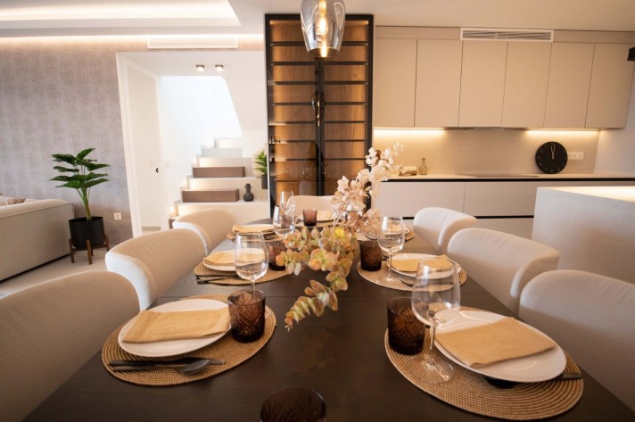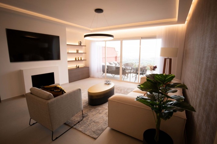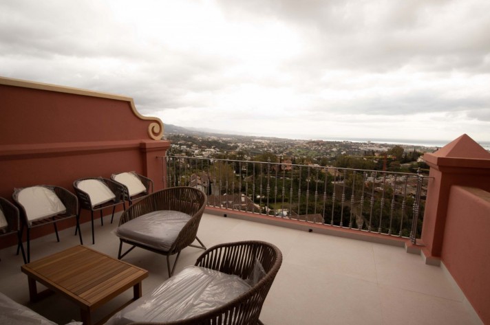 Beautifully presented newly renovated four bedroom duplex penthouse in prestigious urbanization Torre Halcones. Offering the most amazing panoramic sea views across to Gibraltar and Africa as well as La Concha mountain. The luxurious and spacious apartment has been totally renovated to the highest specifications and is offered key ready with all furniture. The two ample terraces from the main living room and upstairs from the master bedroom afford the most amazing sea views. Included in the sales price is a