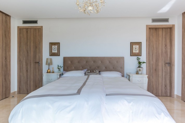 The current owners have done many upgrades to the property therefore this penthouse is like no other in this complex. This penthouse is decorated with a great style and class, and it is immaculately kept by its current owners. It is sold fully furnished, and you will be able to enjoy this luxury home from day one. It is distributed over two levels of the living area and in total you have 165 sqm of the living space + two spacious south facing terraces each over 50m2. The terrace downstairs is covered and the terrace upstairs is uncovered and is a perfect place to sunbathe all year round. On the main level you find a spacious living-dining area with an open plan kitchen, kitchen island and bar table. Huge sliding windows from floor to ceiling with triple glazing leads you onto the terrace. Needless to say, you do not need to go to the terrace to enjoy the views, there are sea views from every corner of this spacious living room. You will also find two bedrooms, one of which is an en-suite, a utility room with washing machine and dryer, and another full bathroom that is also for guests. On the top floor there is a spacious en-suite master bedroom with even more impressive sea views, plenty of wardrobes and access to an upper terrace. Included with the property are two parking spaces in the underground garage and a storage room.