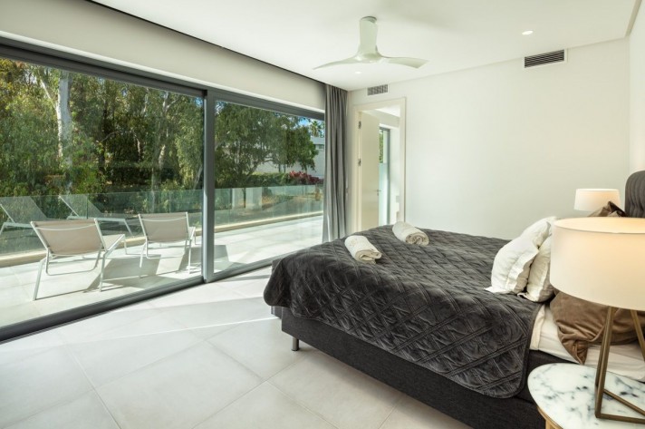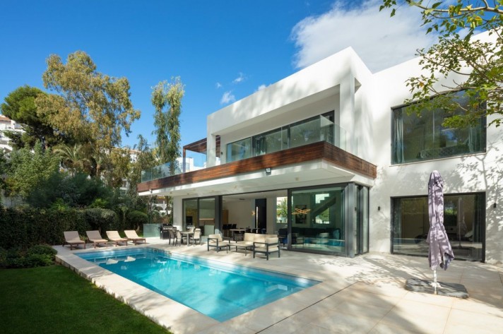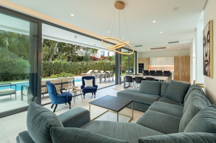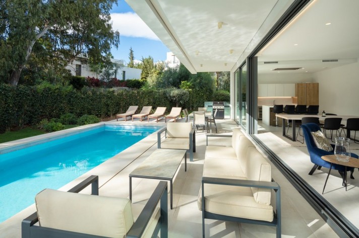 Situated behind the private gates of well-established residential community Arboleda, this completely remodelled home lies in the heart of the New Golden Mile, between Estepona and Marbella. Arboleda offers a convenient and secluded location, where all villas are South and West facing, with scenic views towards a lush green woodland – 50,000m2 of protected nature zone. A beautiful and bright home, featuring Cortizo sliding walls of glass that open to a vast terrace ideal for entertaining, outdoor dining with barbecue, and large heated pool. The spacious main living area has a raised ceiling height of 4.5m, providing light and elegance throughout the property, open dining room with a gourmet kitchen with center island, all areas facing towards the lush tropical gardens that provide privacy and a cosy ambience. Arboleda 18 provides 5 distributed over 3 levels, storage, laundry and machine room. The area is secure and very well connected, a short drive brings you to Atalaya Golf and Country Club and top rated International schools. Within a short walk you have local supermarkets and a variety of shops, bars and restaurants, hairdressers, pharmacies, vets and local amenities.