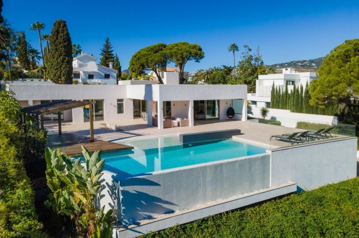 Splendid frontline golf villa located in the heart of the Golf Valley, facing the prestigious Las Brisas golf course. This one-level villa has been built with high quality materials, offering a modern property in a prime location. The villa boasts enviable views to the golf course and La Concha mountain. The villa welcomes you through a beautiful entrance with decorative white stones and charming vegetation. The villa boasts an open-plan layout with a spacious living room, an open-plan fully fitted custom-made Barazza kitchen with steel worktops and high-end appliances and extras such as wine fridge, teppanyaki plate, etc. The living areas have direct access to the terraces, overlooking the infinity swimming pool and the magnificent views to the Golf Valley. The terraces also include water features and a gazebo. This stunning home offers 6 generous bedrooms, with breathtaking views. A charming property in an exclusive location in Marbella worth a viewing!