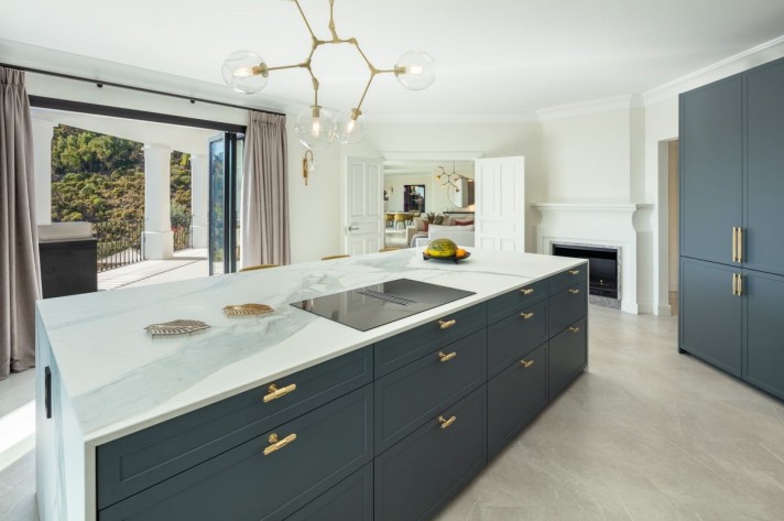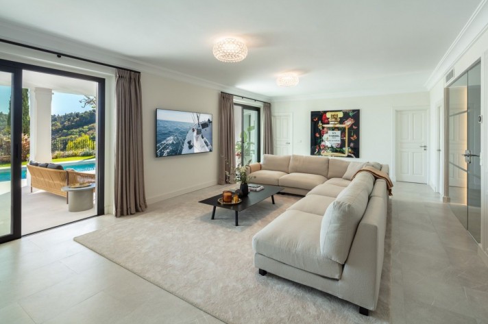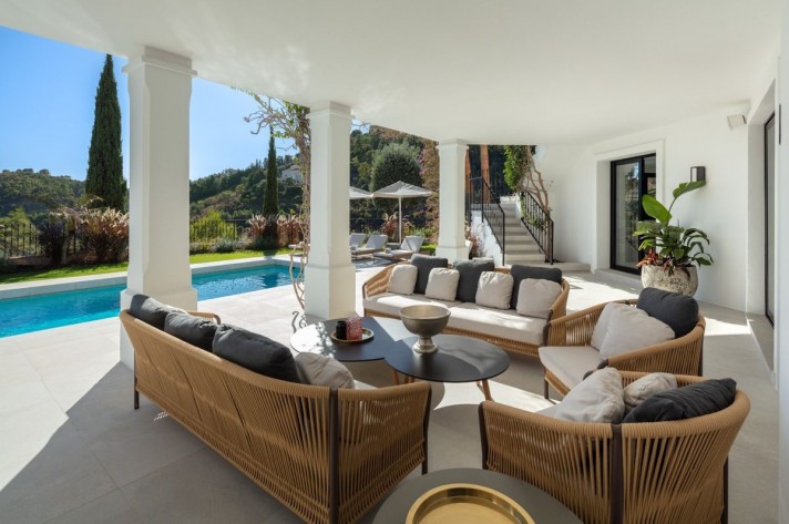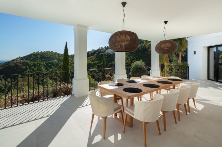 Combining Andalusian architecture with Mediterranean touches, this estate has been designed with great attention to detail, offering the best of outdoor living: spacious covered and uncovered terraces, lush surrounding vegetation, swimming pool with incorporated water features, Jacuzzi and BBQ with outdoor dining area with stunning sea views. Upon entering, the open floor plan and elegant interiors create a harmonious and welcoming environment, all connected to the covered terraces.