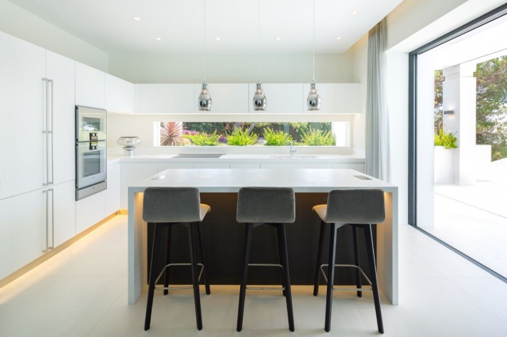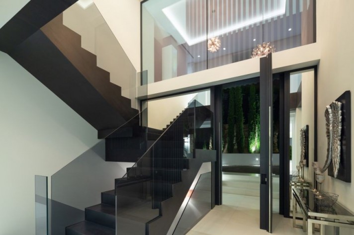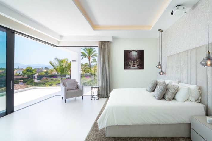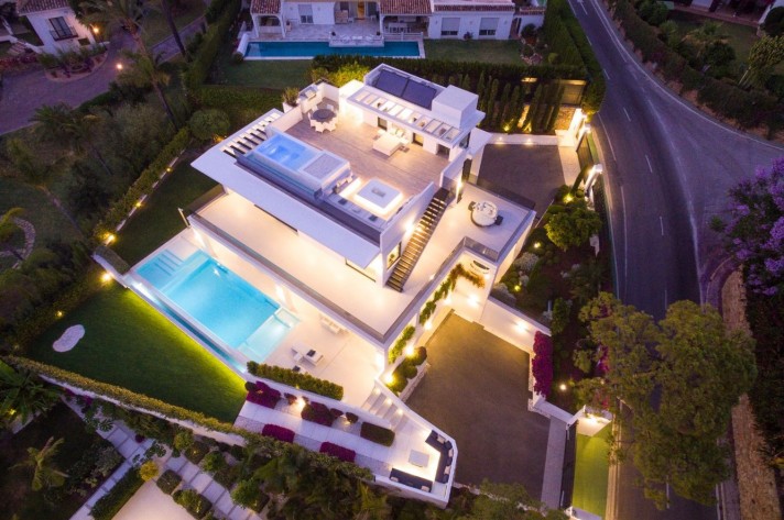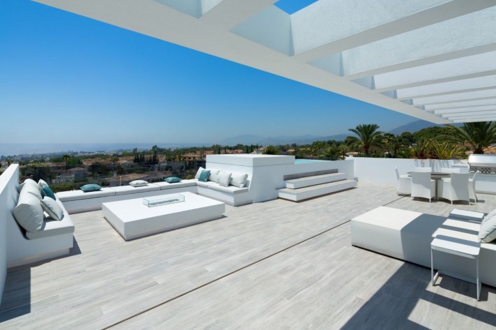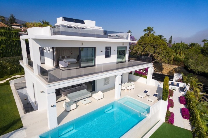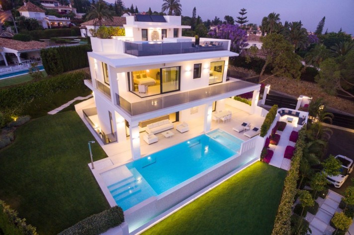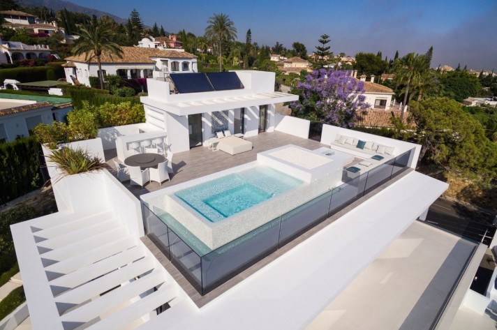 Beautiful contemporary luxury property in Nagueles, one of Marbella's top areas along the Golden Mile, just 10 minutes' drive from Puerto Banus and with easy access to the city center. The building was constructed to the finest standards, paying close attention to every last detail and utilizing premium materials and installations. The home has three storeys, including a basement, as well as a sizable solarium roof terrace. Private garage with turntable mechanism, wonderful entertainment space with TV/cinema room, wine cellar, and lounge are all located on the basement floor.