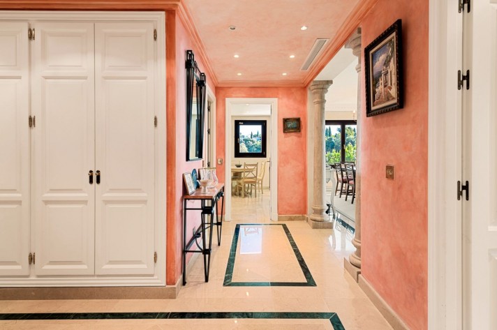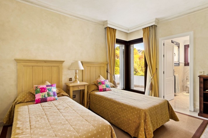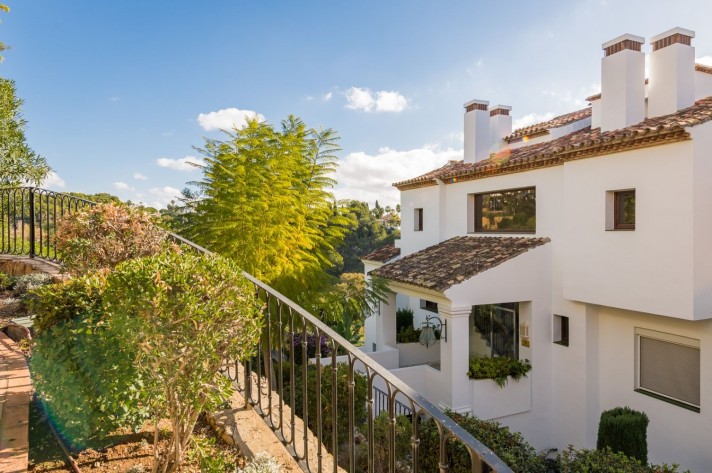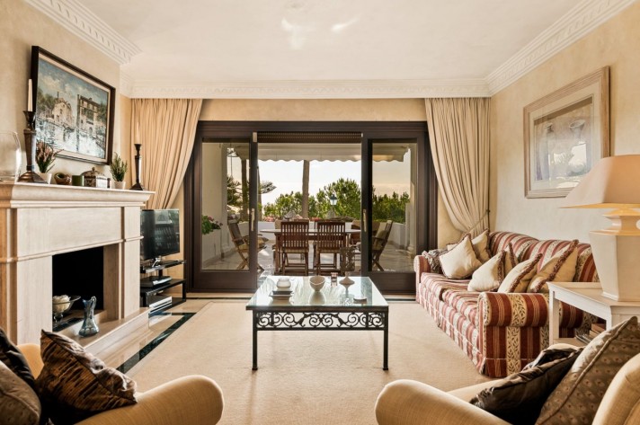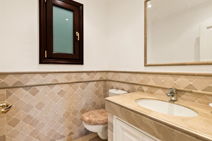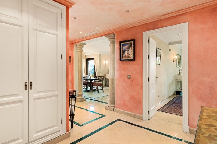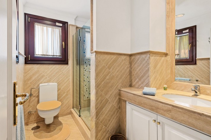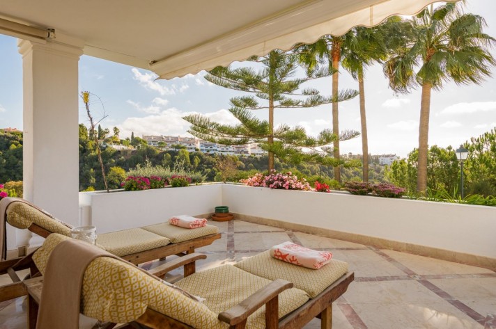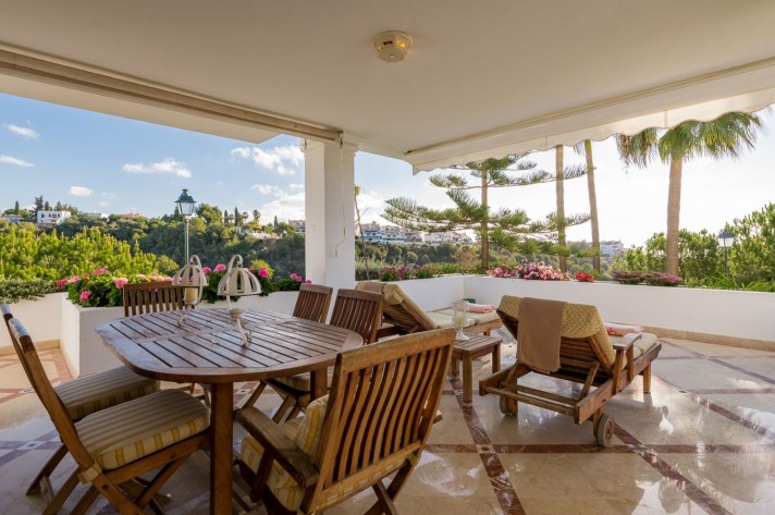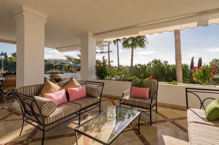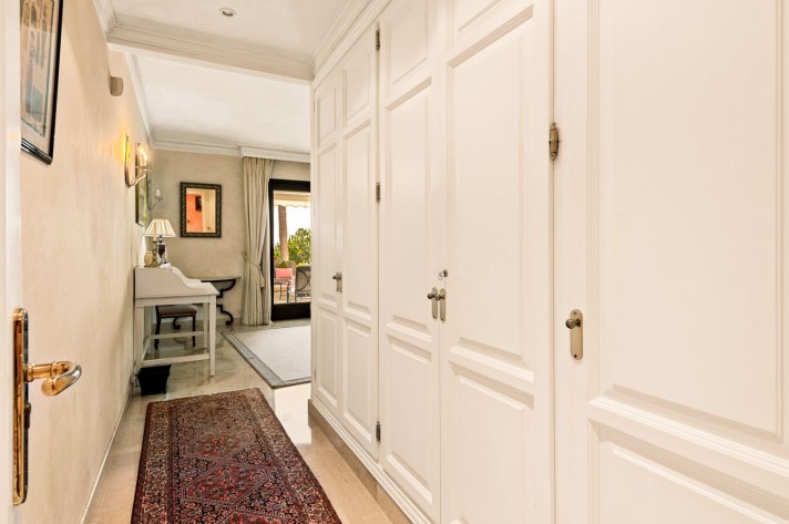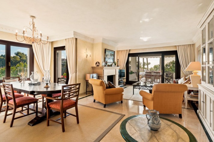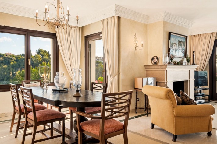 Designed in a typical Andalusian style, from the marble hall of the building we get the direct access to the main entrance of the apartment. The apartment has a living area with fire place, a dining area with direct access to the terrace, Siematic fitted kitchen with all appliances, laundry room, three bedrooms with bathrooms en-suite and also a guest bathroom at the entrance. There are two large terraces, one at the front with open views and south orientation and another with views over the mountains and golf course.