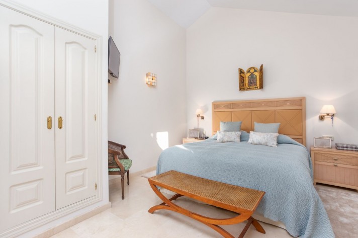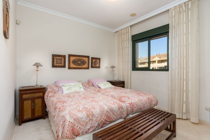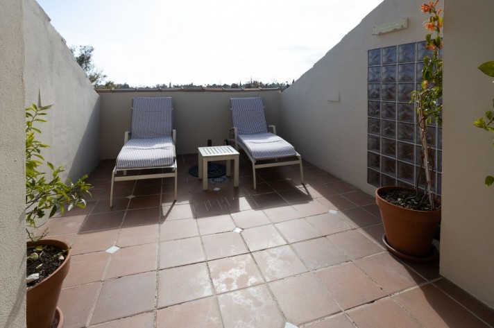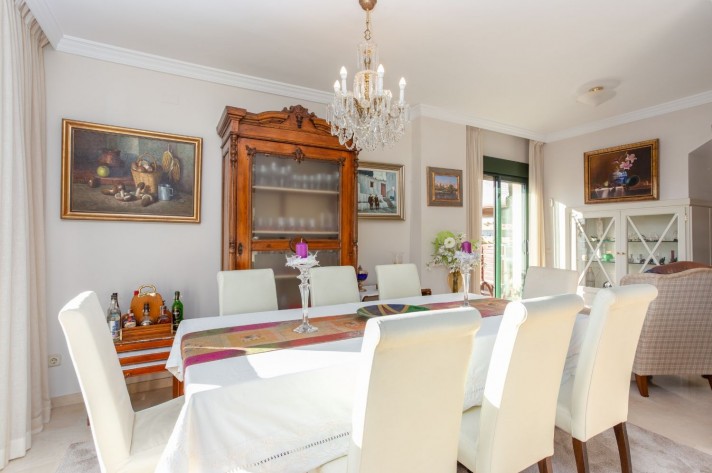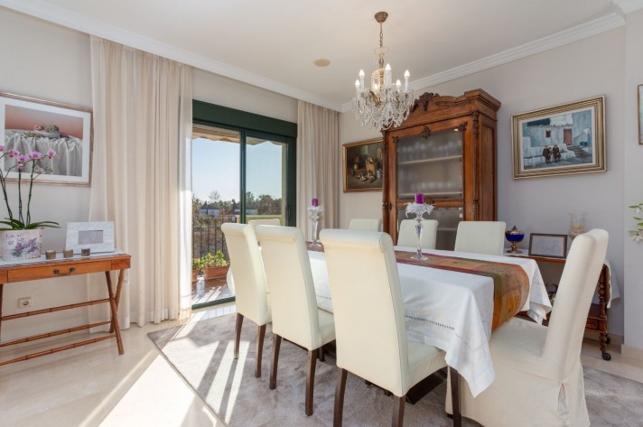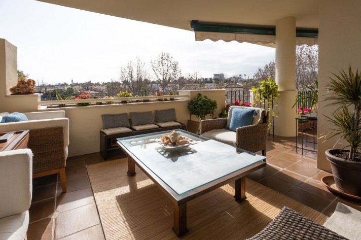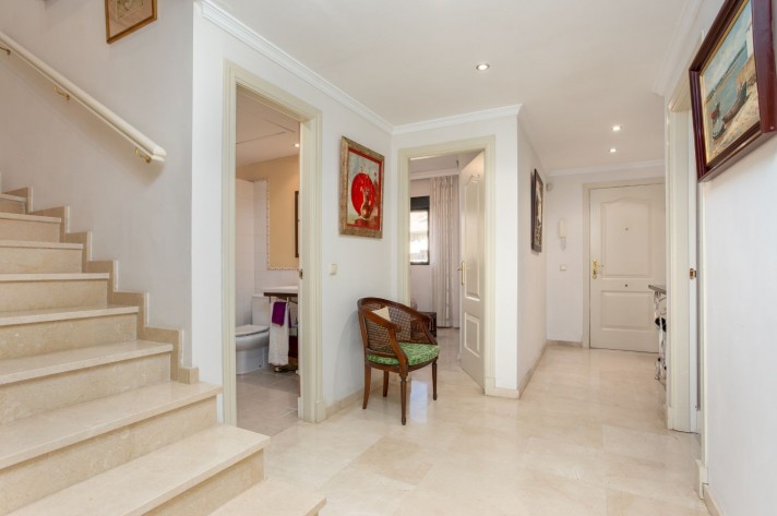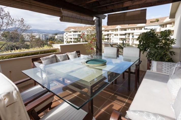 Stunning Southwest corner duplex penthouse first line of Guadalmina golf course, Guadalmina Alta, Marbella. The apartment is distributed in 2 floors: downstairs there is a fully equipped kitchen with laundry, a large living room of 60m2 with exit to two terraces, one with porch and another with covered pergola, guest bedroom and bathroom with shower. Upstairs you find is the master bedroom with two dressing rooms, bathroom en suite with hydro massage shower and private terrace, second bedroom with bathroom en suite with bath and exit to a private terrace and storage room. With peripheral views to the mountain as well as the sea. Sold unfurnished, has air conditioning hot/cold, piped music, blinds and safe box. With 2 garages and two storage rooms (one in the property and other in garage). Total built: 194m2, terraces: 68m2. The urbanization has 24-hour guard, gym, 3 swimming pools and is surrounded by very well-tended gardens. 3 Bedrooms, 3 Bathrooms. Puerto Banús is only 5 minutes away by car, the old town of Marbella is 7 minutes away and Malaga airport is 45 minutes away.