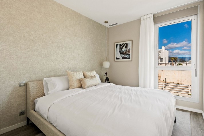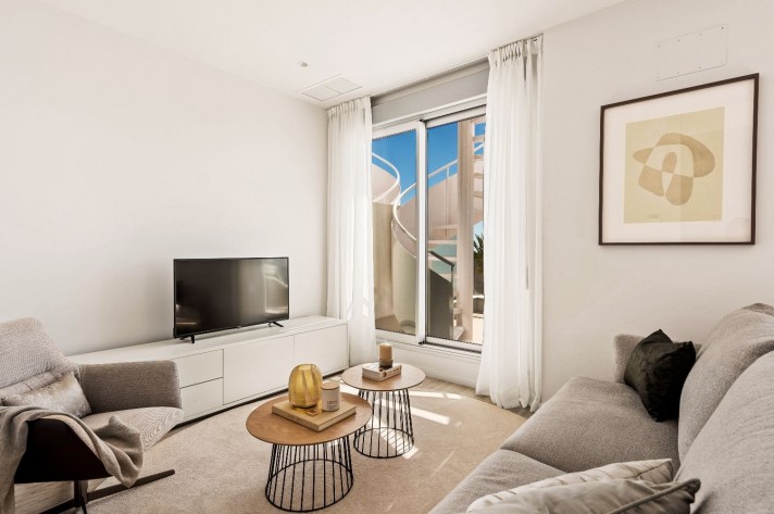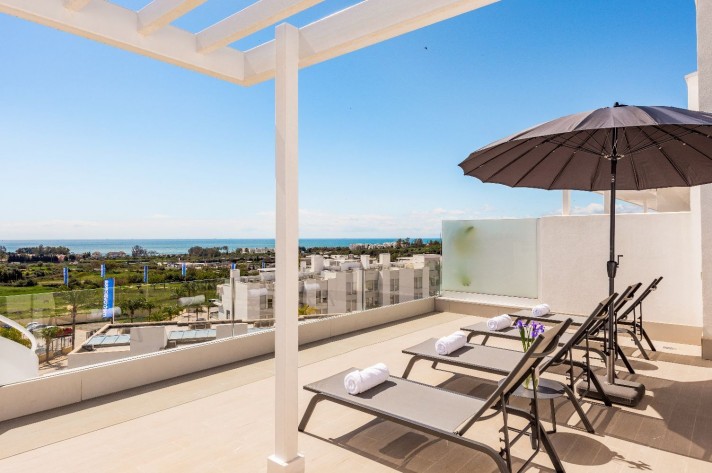 This 2 bedrooms duplex penthouse is located in the new Golden Mile, in Cancelada walking distance to amenities and services and just a few minutes driving from Hotel Anantara Villa Padierna, golf course los Flamingos, Saladillo Beach and Villacana. Contemporary design, comfort and quality combine all this with plenty of light and a unique living. Ground floor level have direct access to living area with open plan kitchen fully fitted and direct access to the terrace , two bedrooms with two bathrooms on suite, one of them with bath and the other one with walking shower, on the top floor there is a generous solarium with open views over the Mediterranean Sea. Porcelanic tiles, fitted kitchen with appliances, video porter, fitted wardrobes , double glazzing, shutters in windows, parking space and storage. This exclusive penthouse offer stunning views to the Mediterranean Sea and is surrounded by beautiful gardens and a beautiful pool. Residents gain access to the St. Vista Clubhouse and benefit from numerous leisure facilities and other amenities in the area.