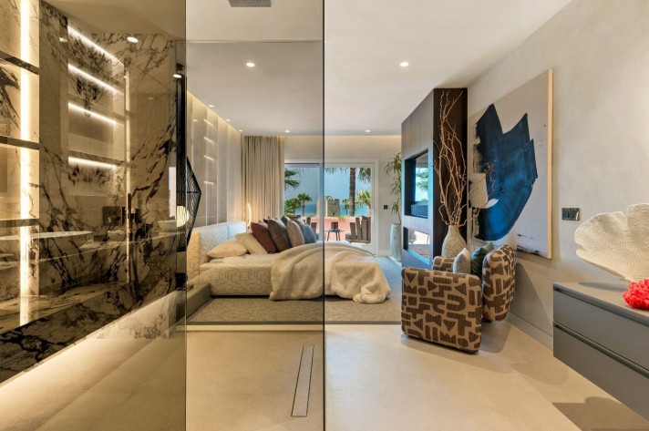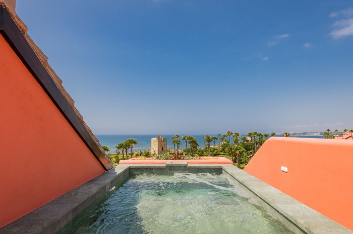 Fully renovated top quality 4-bedroom penthouse in the New Golden Mile . Frontline beach, south facing, sea views, quiet and private. Direct access to the beach. Spacious living and dining area with fully fitted open plan kitchen (Siemens appliances) and direct access toa large terrace with bbq, master bedroom ensuite, three guest bedrooms and three bathrooms. Very spacious roof terrace with yoga area / outdoor gym, chill out zone with TV, jacuzzi and sauna. Two underground parking and two storages. Communal nature, lush gardens, gym and community outdoor and indoor pool. Great location. Less then 5 minutes drive to all amenities.