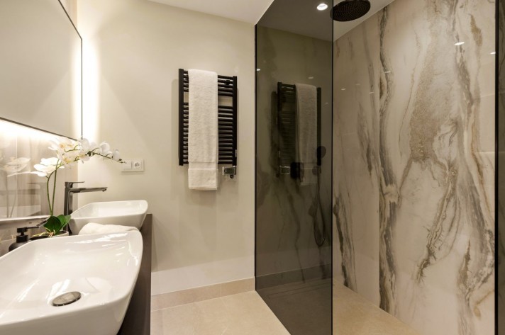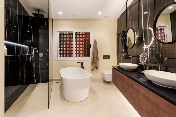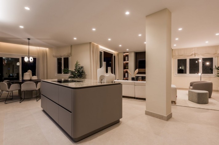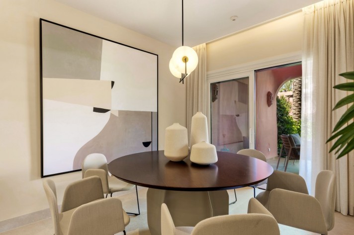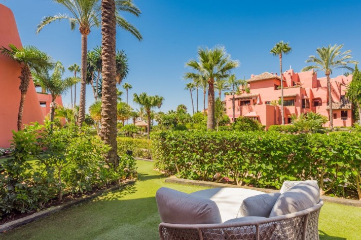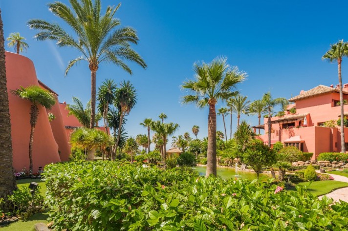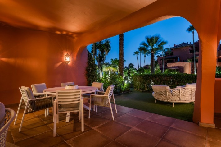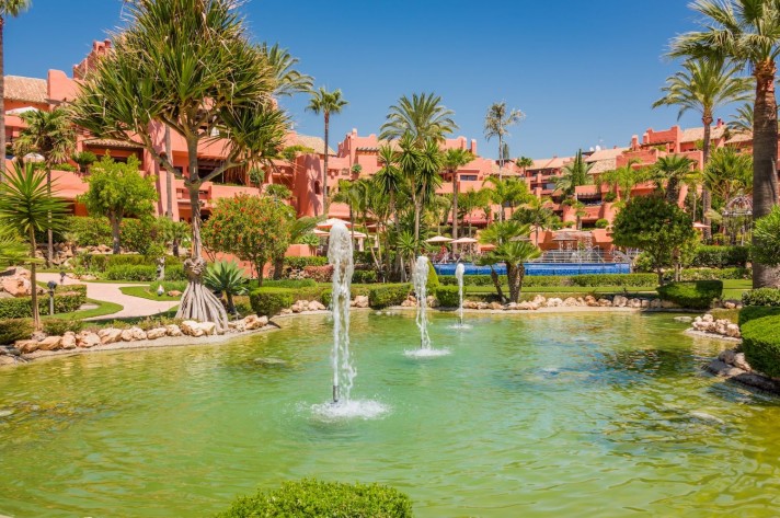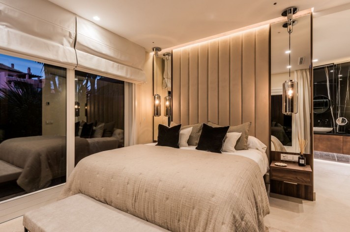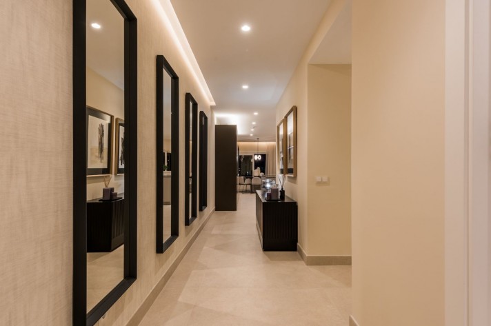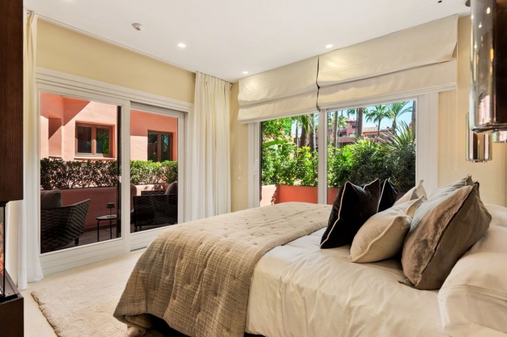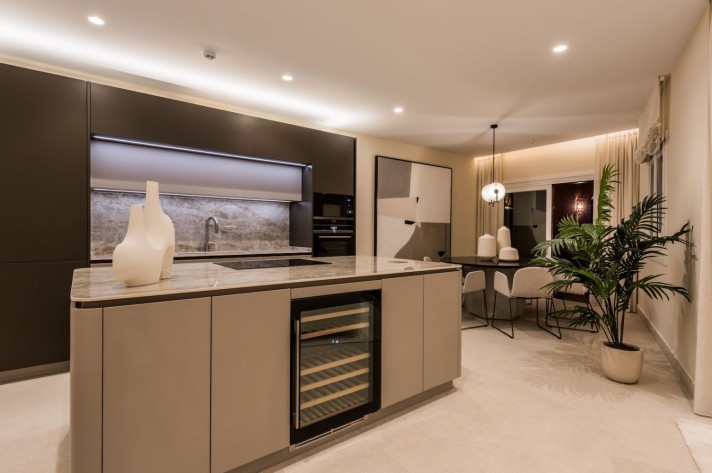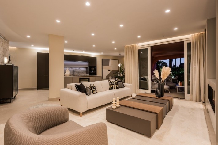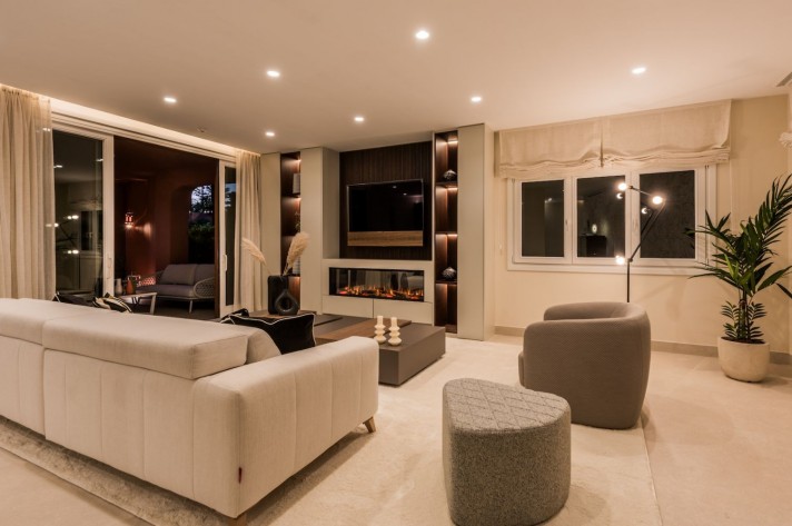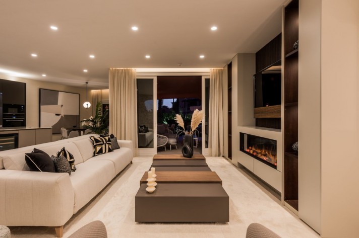 bedroom and 2 bathroom apartment on the New Golden Mile between Marbella and Estepona is the one for you! The apartment has a modern interior with an open designer kitchen with the best German appliances and a very spacious living and dining room. The impressive interior features many luxurious details such as tailormade wardrobes, an electric fireplace and a Bang & Olufsen sound system. The beautiful terrace allows you to easily access the communal pools and invites you to enjoy the lush gardens of this high-end community. Torre Bermeja is a gated complex with 24-hour security which is well known for its mature landscaped gardens and its amazing "5 star" facilities such as 2 outdoor pools, 2 gyms, an indoor pool and 2 saunas. It has easy access to the beach and promenade and several amazing restaurants are also within walking distance. The apartment comes with an underground parking and a storage room.