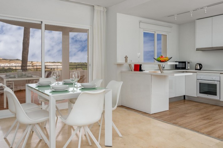 The living/dining area with an open plan fitted kitchen, master bedroom en suite and one guest bedroom with bathroom. and ample terraces. The community offers a gardens and swimming pool.