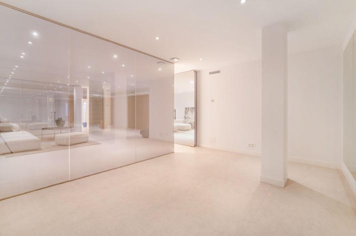 The property includes a basement with sofa group, two bedrooms, one of which has a walk-in closet, and two bathrooms. There is also a gym with mirrors that is ready to use, all you need is your equipment. Furthermore, a bar or a library can also be added on this level.