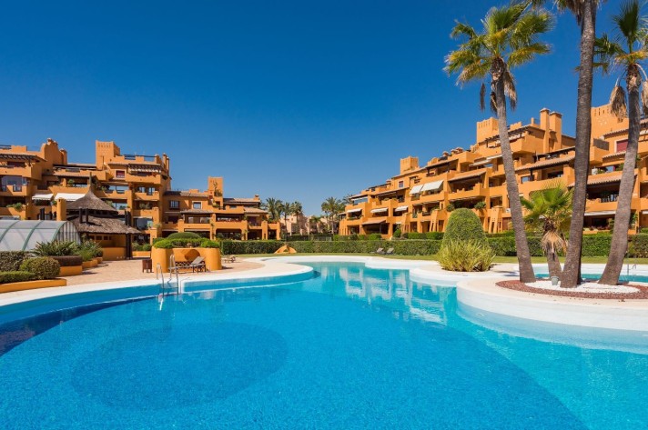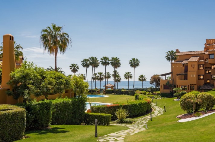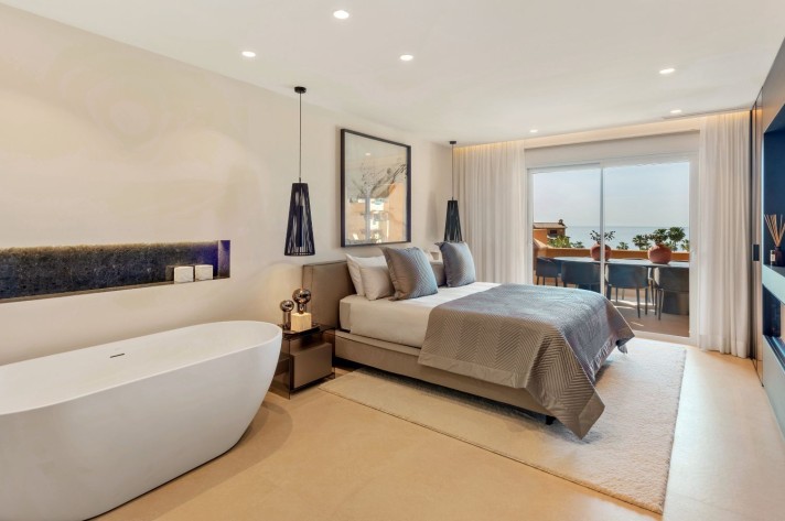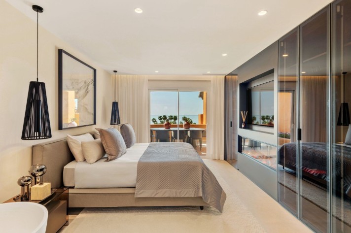 Fully renovated top quality 4-bedroom apartment in Granados del Mar. Frontline beach, south/west facing, sea views, quiet and private. Direct access to the beach. Spacious living and dining area with fully fitted open plan kitchen (Miele appliances) and direct access to a large terrace, master bedroom ensuite and three guest bedrooms, one ensuite and other two sharing one bathroom. One underground parking and one storage. Communal nature, lush gardens, gym and community outdoor and indoor pool. Great location. Less then 5 minutes drive to all amenities.