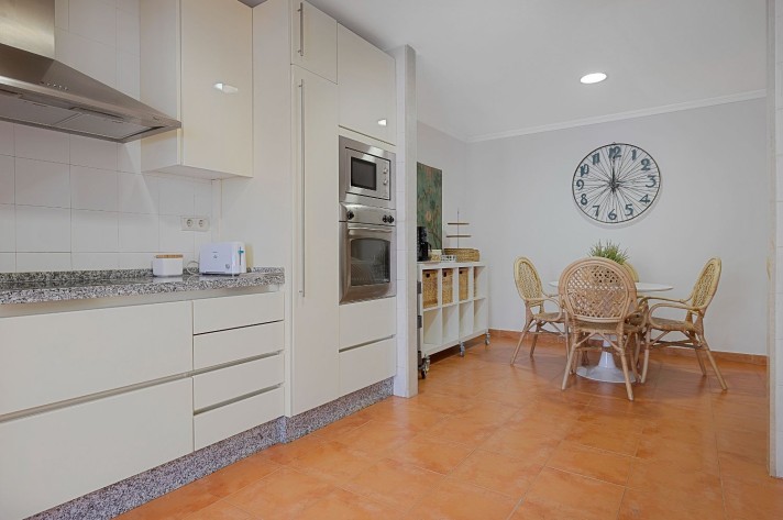 Entrance hall way, living and dining area with fireplace, fully fitted kitchen with breakfast corner and a separate laundy room. Direct access to the 65m2 covered and open terrace.