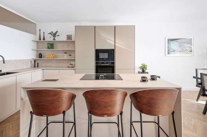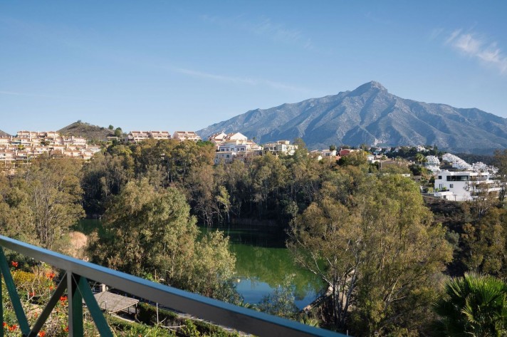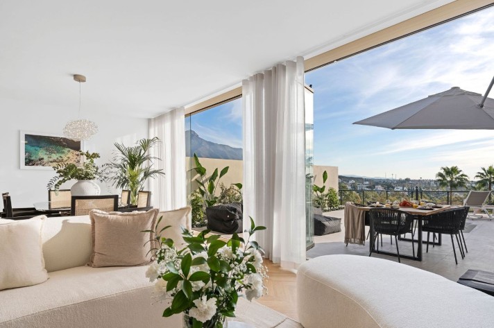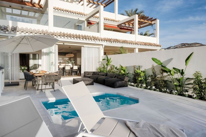 A luxurious four-bedroom apartment with a private pool and garden, offering stunning sea and mountain views. This renovated ground-floor apartment is a haven of modern, Parisian style living in the heart of Nueva Andalucia, La Cerquilla.