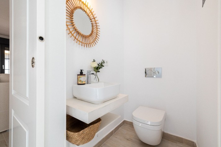 An interior patio that adds Andalusian character and charm floods this level with natural light. There are two extremely roomy bedrooms and a large bathroom with a patio on the first level. The third bedroom and a second bathroom are located on the third floor. A sizable solarium offering lovely views of the Bermeja mountain range and Estepona's historic town may be accessed from this point. It is strongly advised to view this opulent townhouse that is ready for keys.