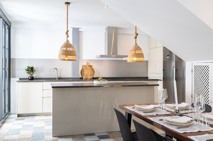 The townhouse has three bedrooms spread across three floors. A large, light-filled open concept living room and dining area with a contemporary, fully furnished kitchen featuring a central island can be found on the ground floor, entrance level.