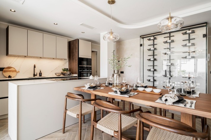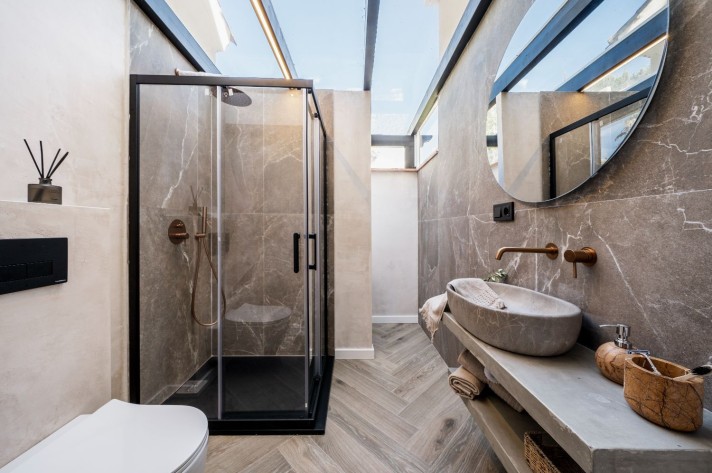 Back downstairs, the master suite is well separated from the other two bedrooms. Decorated in a contemporary style, it has a comfortable open wardrobe and an en-suite bathroom with exquisite materials. The second bedroom is also en-suite, with the unique feature of a glass ceiling in the bathroom, creating the effect of showering under the sky without feeling cold. The third bedroom is next to a well-appointed third bathroom, which also serves guests.