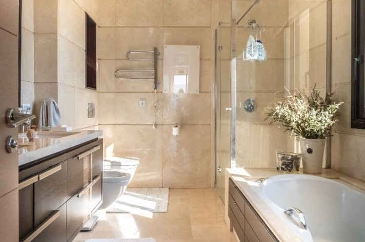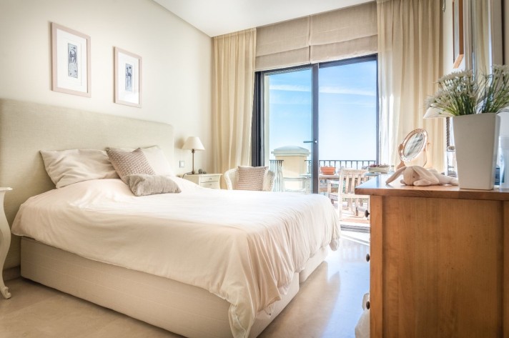 The open-plan living and dining areas are designed in a sleek, minimalist style, while the well-appointed kitchen is generous in size and equipped with high- quality appliances and views out to the mountains of Benahavis,