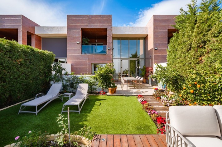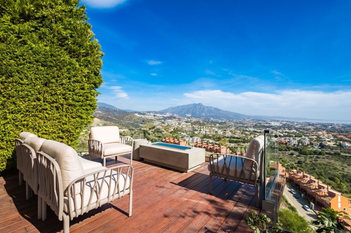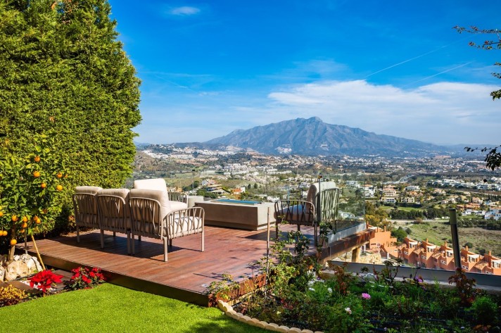 Modern semi-detached house in Benahavís, a small fully gated residential complex of only 8 homes situated 10 minutes' drive to several golf courses, the beach and all amenities. Offering outstanding open views to the sea, the mountains and the surroundings, this house comprises 3 bedrooms, one of them en suite and the others sharing a bathroom; guest toilet; a spacious and bright living room with dining room, fully equipped kitchen, private garden, garage and multipurpose room. It is within a private