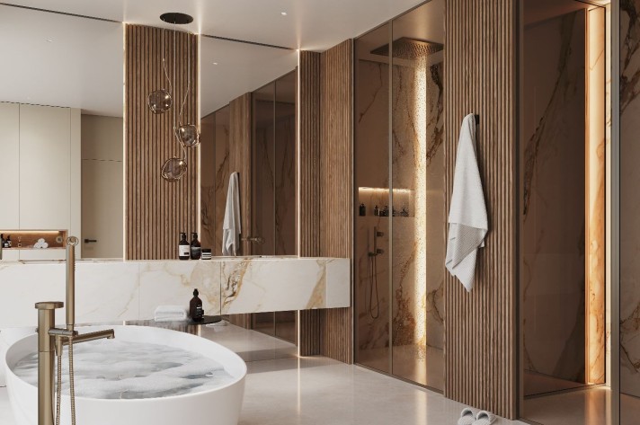 The developers have spared no expense in creating this architectural masterpiece. Enter through a striking bridge over a serene water feature that cascades down to the lower level, leading to an impressive oversized wooden door. Upon entering, you are greeted by a grand double-height hallway, which opens into an expansive lounge almost 10 meters wide. To the right, a vast open-plan space includes a sleek, modern kitchen, while the main dining area lies to the left. The ground floor also houses two luxurious bedroom suites with en-suite bathrooms.
